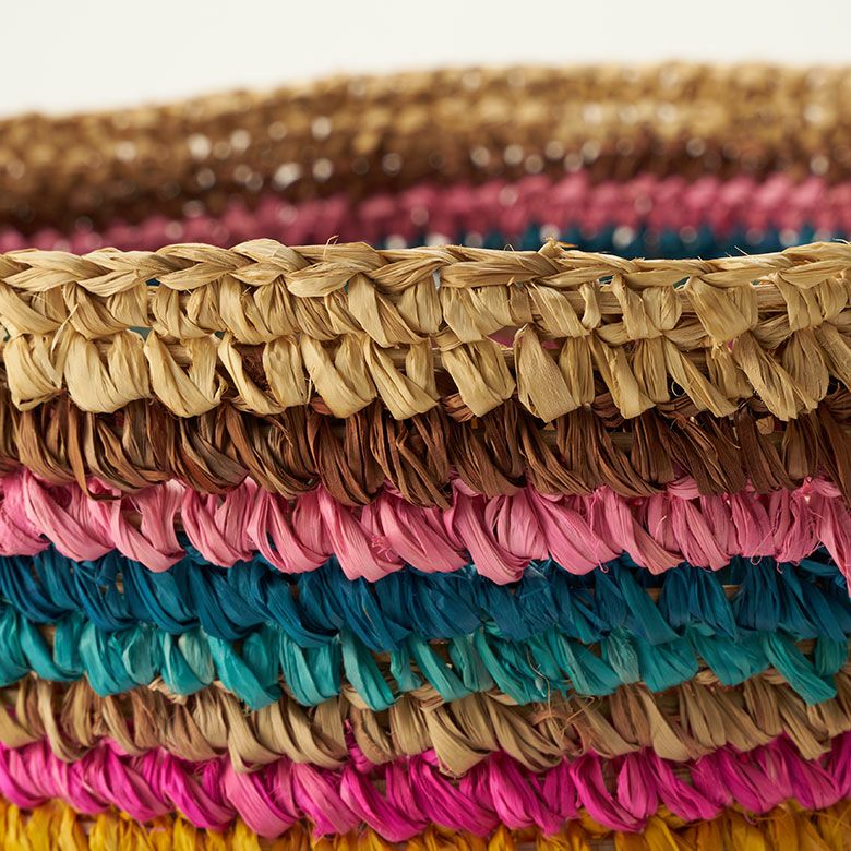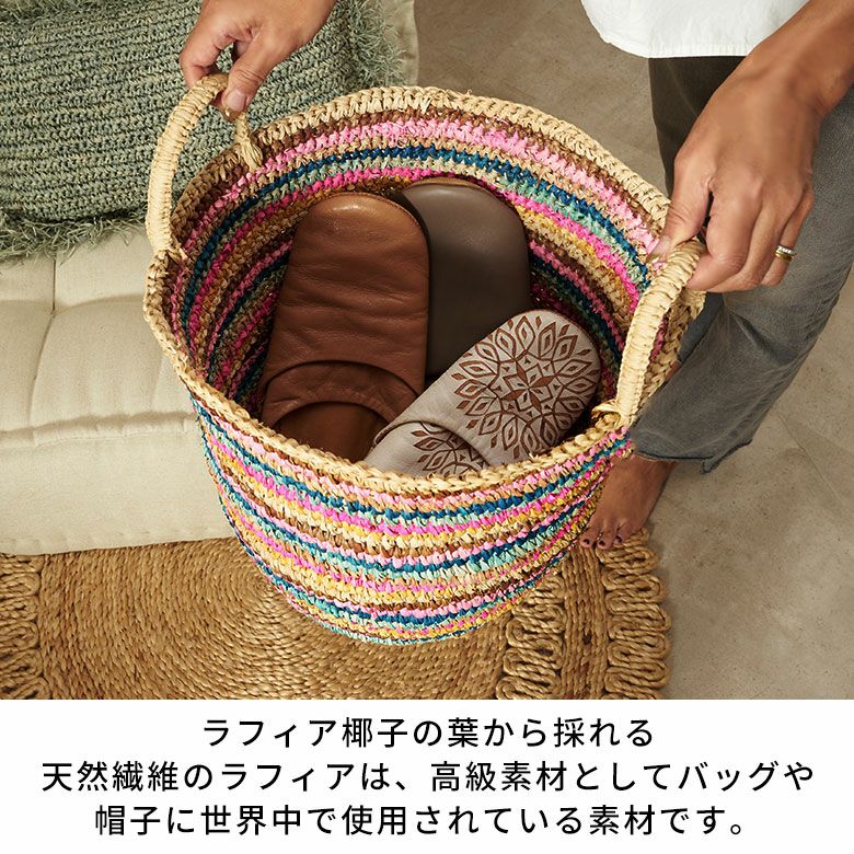 自然の風合いが心地よい天然ラフィア素材を贅沢に使用した収納バスケットが新登場 軽くて柔らかな天然素材ラフィアで編まれたハンドル付き収納バスケット(Mサイズ)[14207]