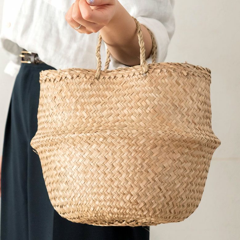 リビング インテリア 子供用 キッズ 卓上 棚上 キッチン かご バスケット シーグラス製 天然素材 収納 持ち手 折り畳み 2way [51250]【 カゴ 籠 収納バスケット ストッカー 野菜入れ 荷物入れ 見せる収納 ハンドル 丸形 おもちゃ入れ おしゃれ 北欧 ハンドメイド リゾート BOHO ナチュラル エスニック アジアン雑貨 】