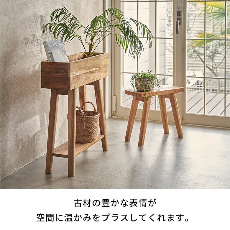 ベンチと合わて使えば、古材の豊かな表情でコーディネートをより奥深いものに。