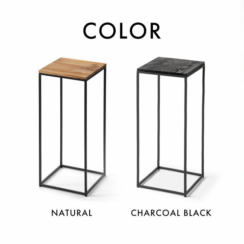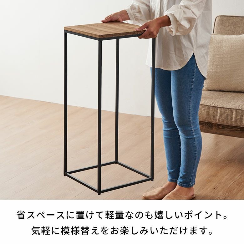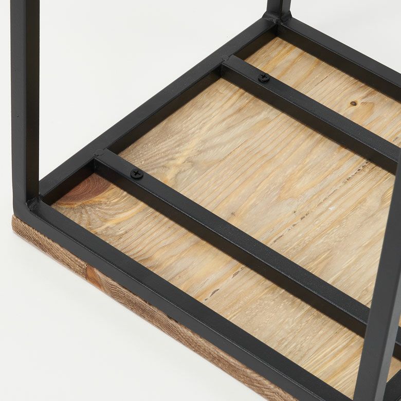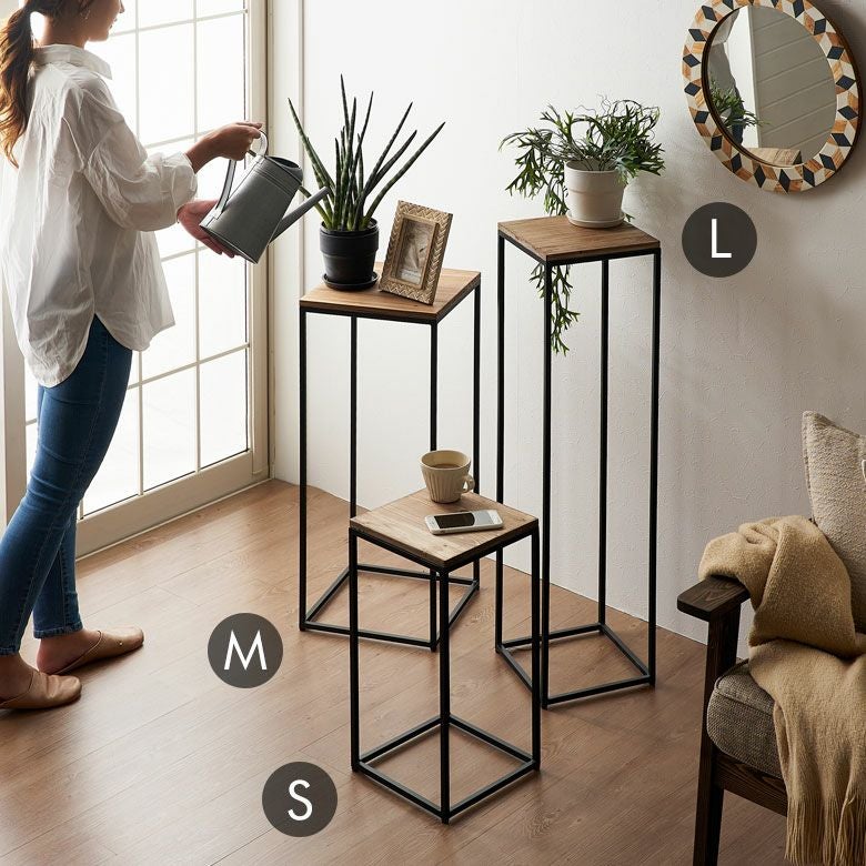 アップサイクルのパインウッド材とスリムなアイアンスタンドを組み合わせたスタイリッシュなデザインは、植物やオブジェを引き立て、空間をセンスよく演出。天板はあえて釘跡や傷を残し、ひとつひとつ異なる木目や風合いを味わえるのも魅力。アイアン部分にはパウダーコーティングを施し、耐久性とお手入れのしやすさを両立しています。