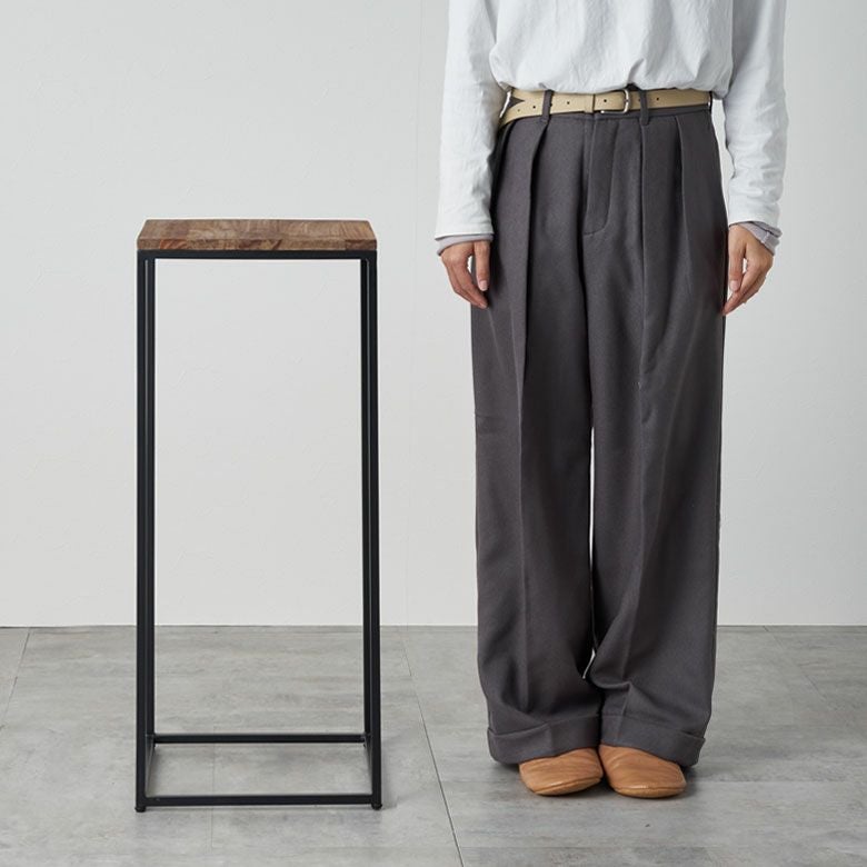 アップサイクルのパインウッド材の天板にスリムなアイアンスタンドを合わせたシンプルながらもスタイリッシュなデザイン。植物やオブジェを引き立て、空間をセンスよく演出。
