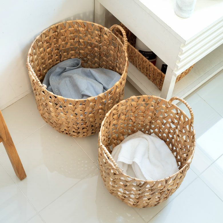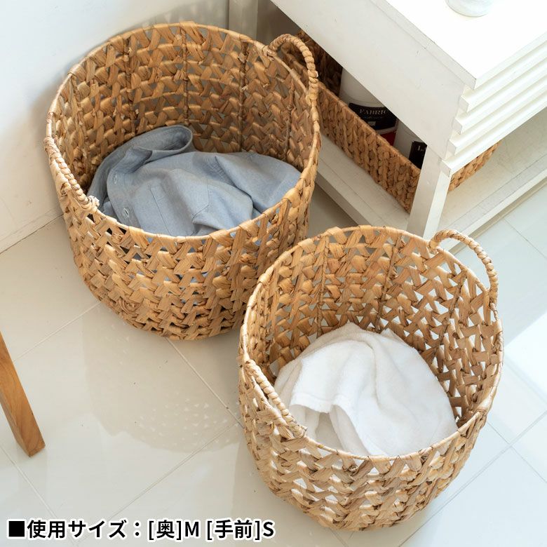 かごバスケット 収納かご ナチュラル雑貨 取っ手付き ラウンド型 バスケット かご ウォーターヒヤシンスで編まれた透かし編みバスケット 持ち手つき S M 2個セット ナチュラル ラウンド [set-va51217-18]【 カゴ 籠 プランターカバー 収納バスケット お洒落 おしゃれ リビング ベッドルーム 寝室 テーブル下 アジアン 雑貨 アジア 】