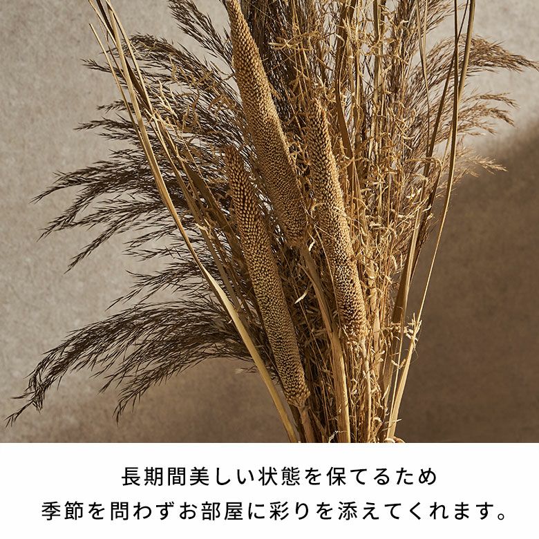 麦やガマの穂など、大小様々な形のドライフラワーを束ねて作られたアレンジメントは、自然素材ならではの温もりと華やかさを空間に添えてくれるインテリアアイテムです。お手入れが不要なため、忙しい方でも気軽に楽しめます。美しい状態を保てるため、季節を問わずお部屋に彩りを添えてくれます。