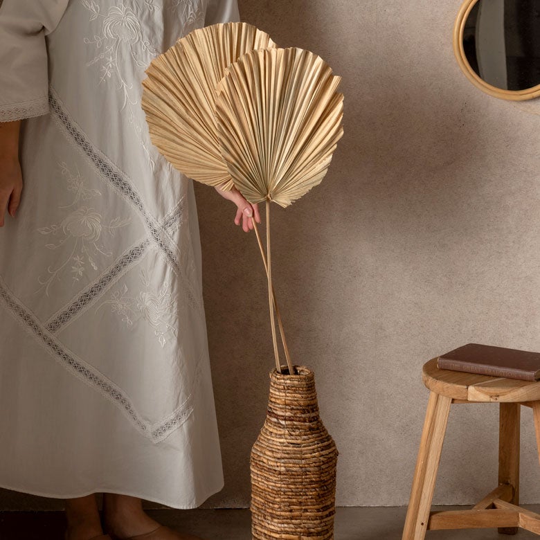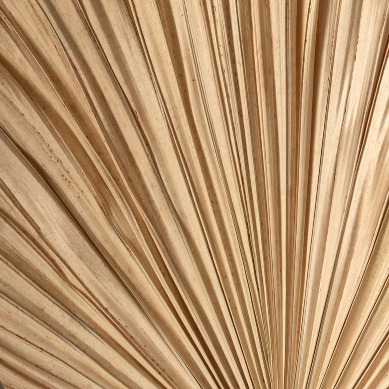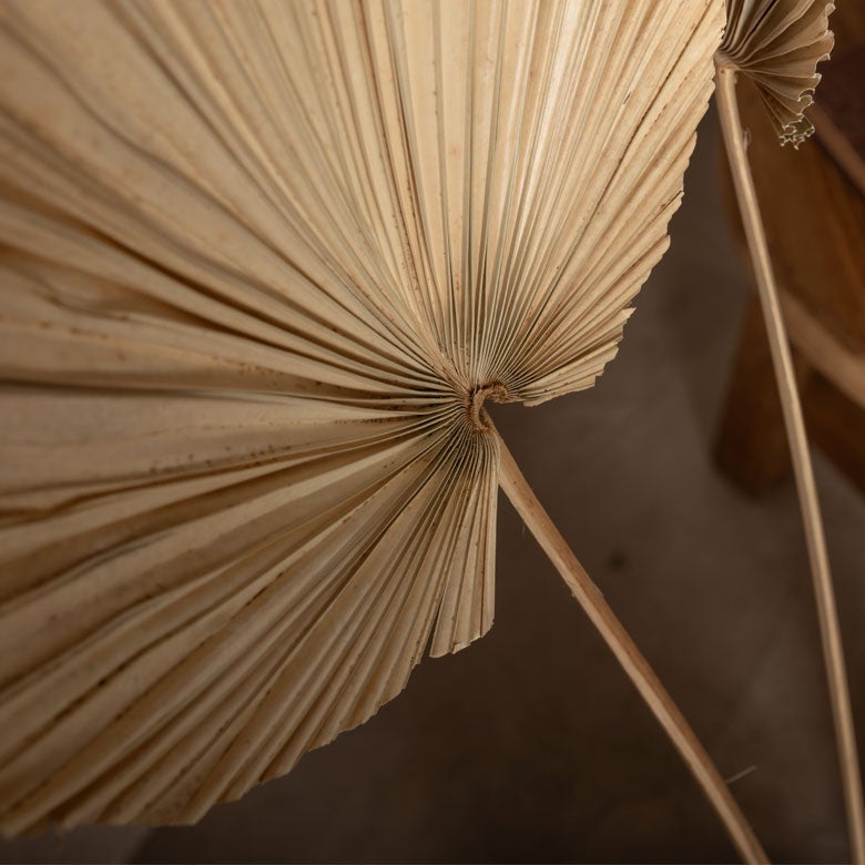 インドネシアの豊かな自然の中で育ったパームリーフ(ヤシの葉)を丁寧に乾燥させ、そのままの造形美を活かしたドライリーフオブジェ。扇状に広がるフォルムと繊細な葉脈は、自然が描いたデザインそのものです。