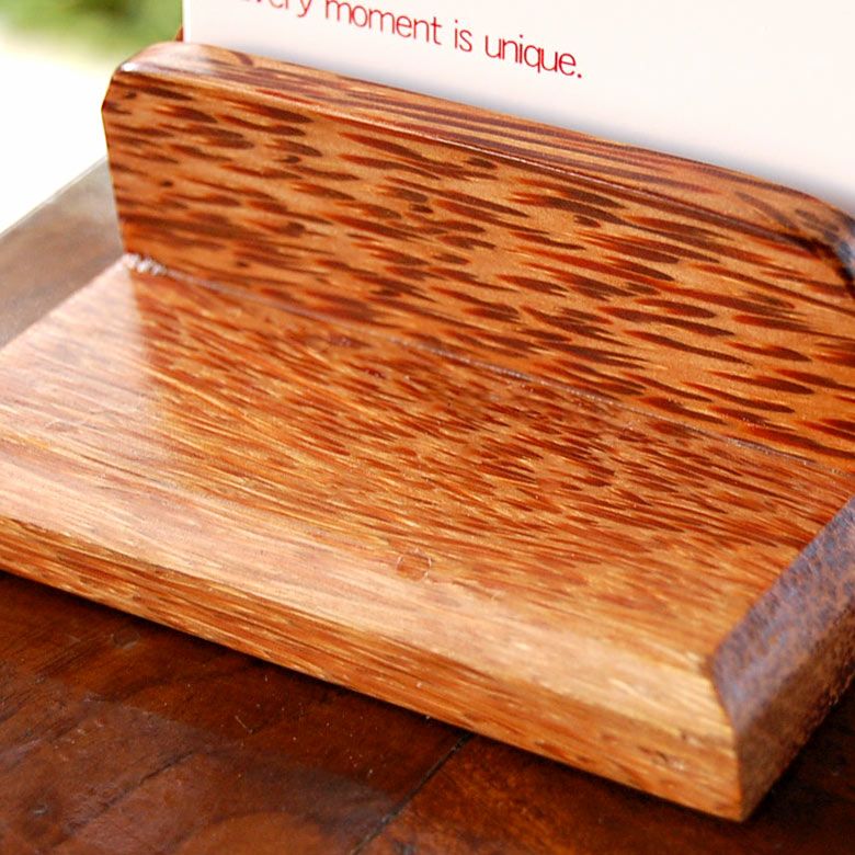 ココナッツウッドの質感を惹きだすカードスタンドは、シンプルなデザイン。