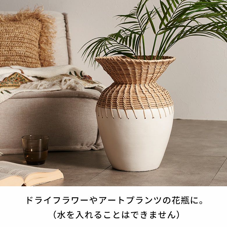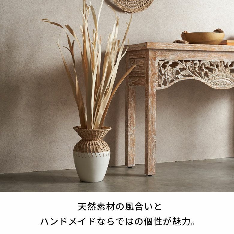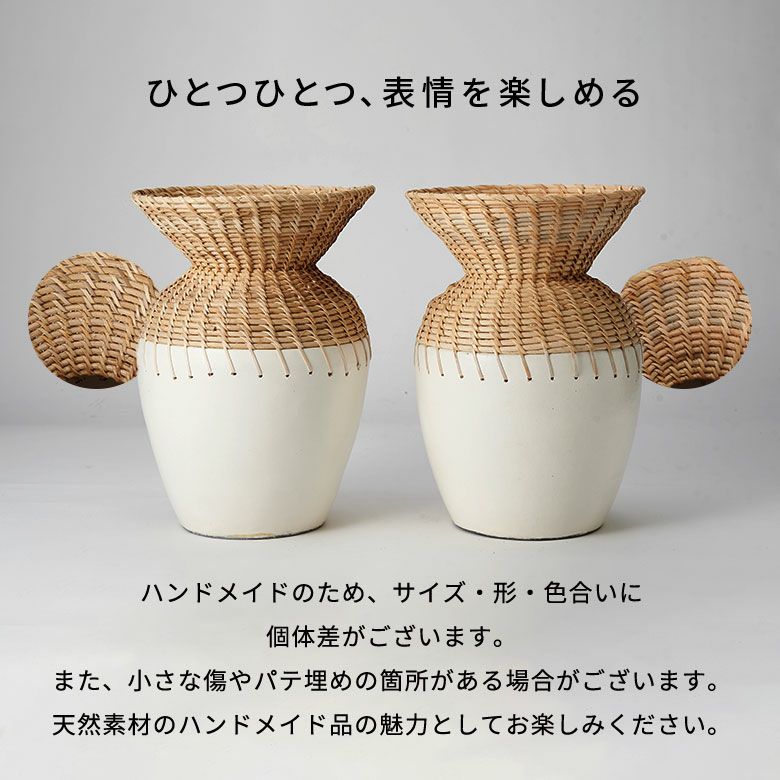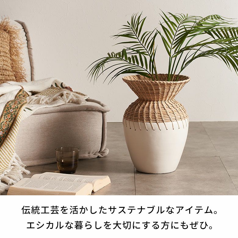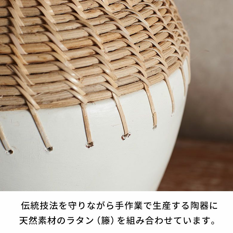 インドネシア・ロンボク島の職人たちが、伝統技法を守りながら手作業で生産する陶器。良質な土を精製し、ろくろで形作った後、藁をかぶせて直火で焼き上げる独自の製法で、温かみのある仕上がりが特徴です。この陶器にラタンを組み合わせたのが、こちらのフラワーベース。個性あるデザインは素朴ながらも存在感があり、ドライフラワー用の花瓶やオブジェとして活躍します。ユーカリやパンパスグラスを飾れば、ボヘミアンやナチュラルな雰囲気に。