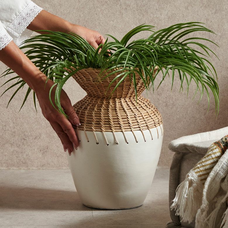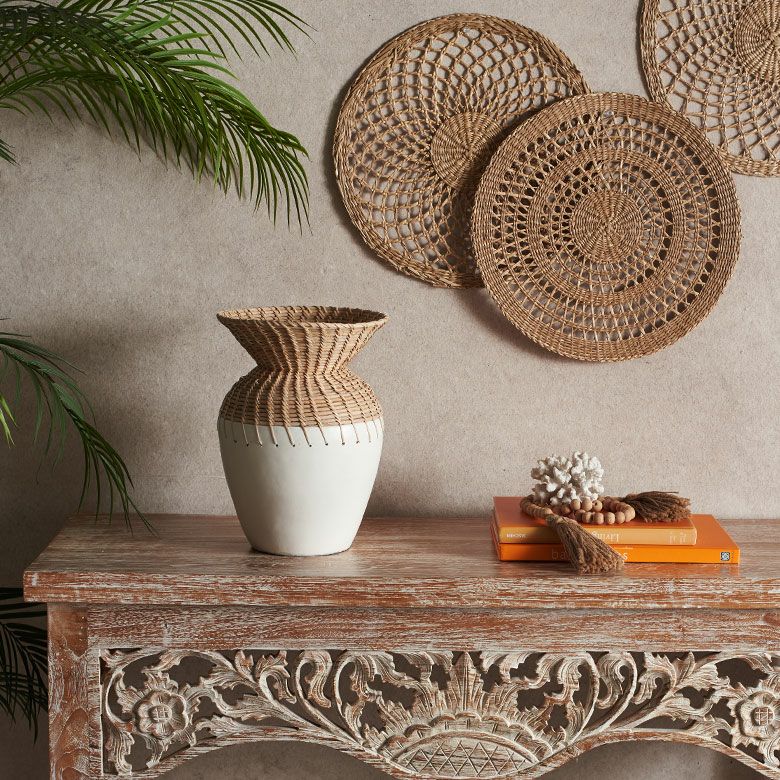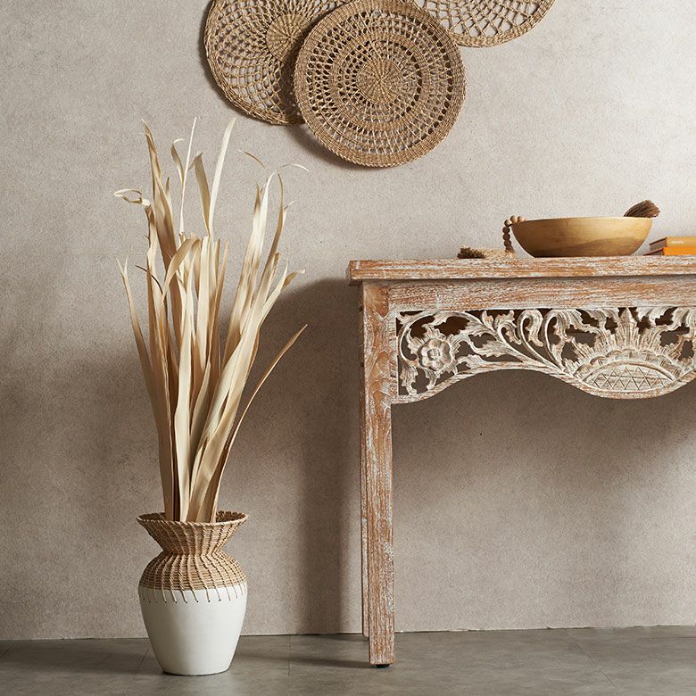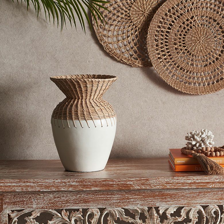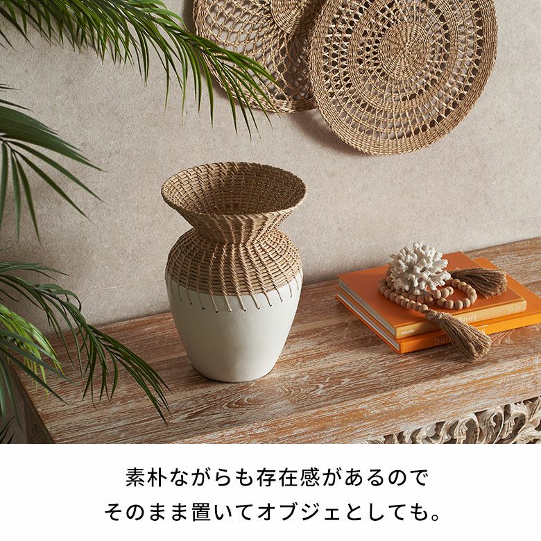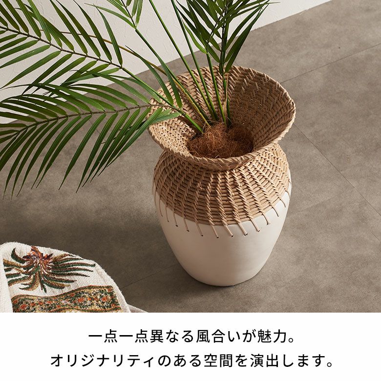 インドネシア・ロンボク島の職人たちが、伝統技法を守りながら手作業で生産する陶器。良質な土を精製し、ろくろで形作った後、藁をかぶせて直火で焼き上げる独自の製法で、温かみのある仕上がりが特徴です。この陶器にラタンを組み合わせたのが、こちらのフラワーベース。個性あるデザインは素朴ながらも存在感があり、ドライフラワー用の花瓶やオブジェとして活躍します。ユーカリやパンパスグラスを飾れば、ボヘミアンやナチュラルな雰囲気に。