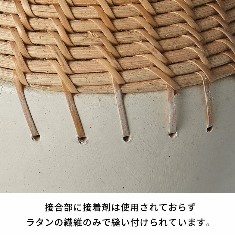 ・無機質な陶器と有機的なラタンの組み合わせが独特の存在感を放ちます。