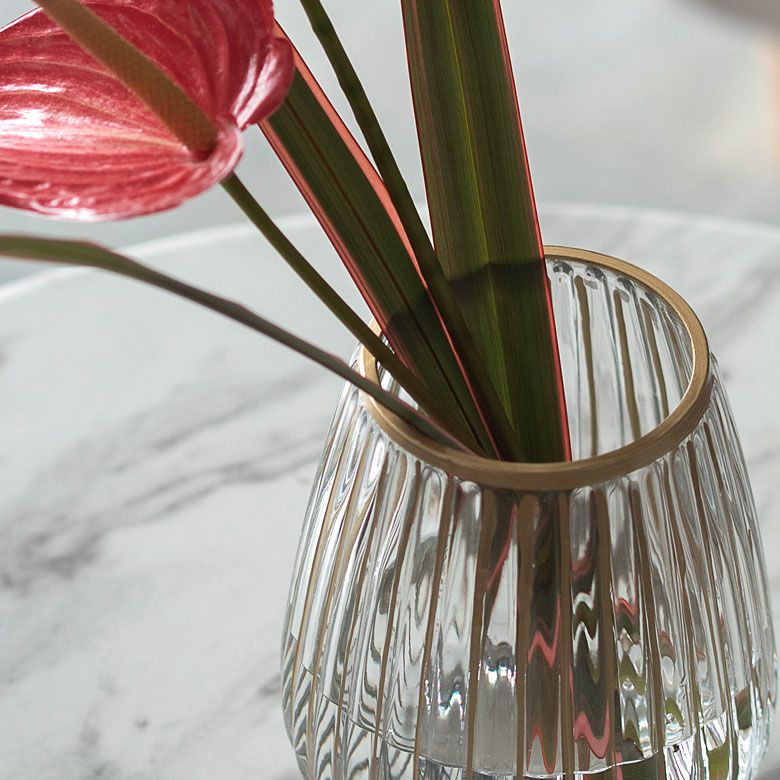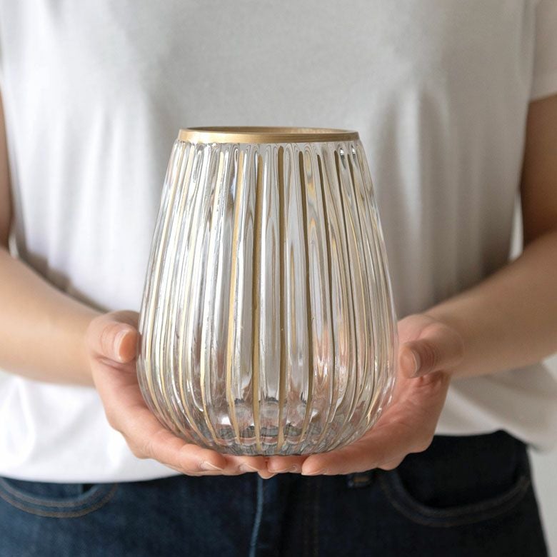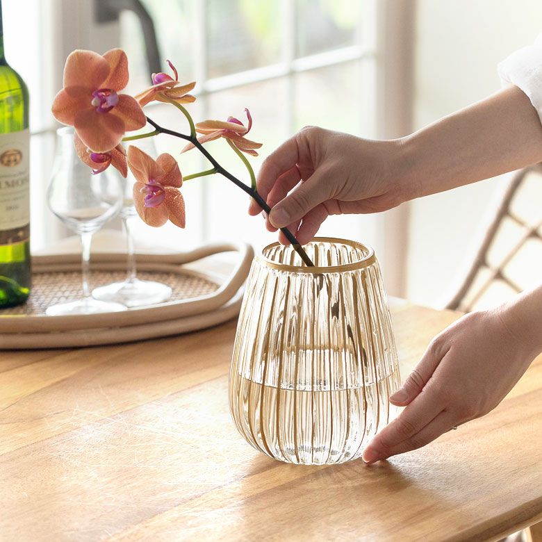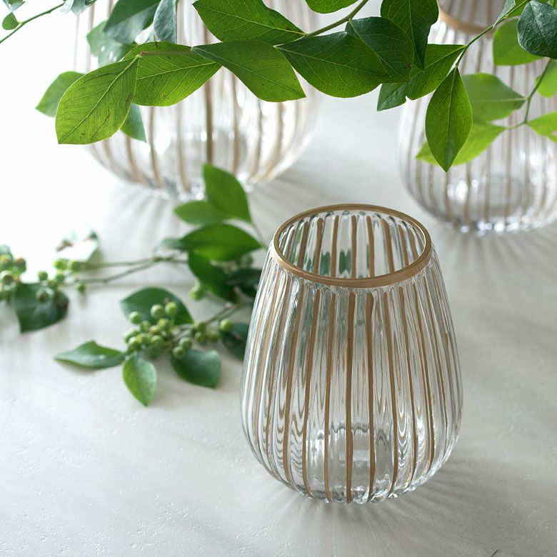 クリアのソーダガラスに、手書きのゴールドラインが映えるフラワーベース。