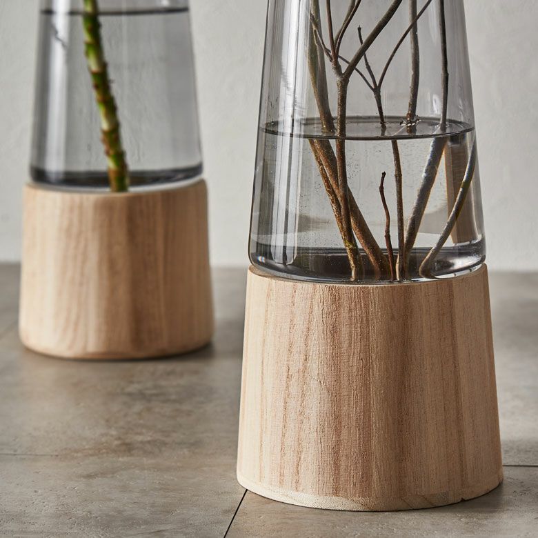 スモークグレーのガラスと、ナチュラルウッドの土台の組み合わせが