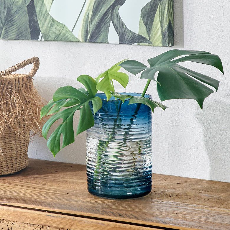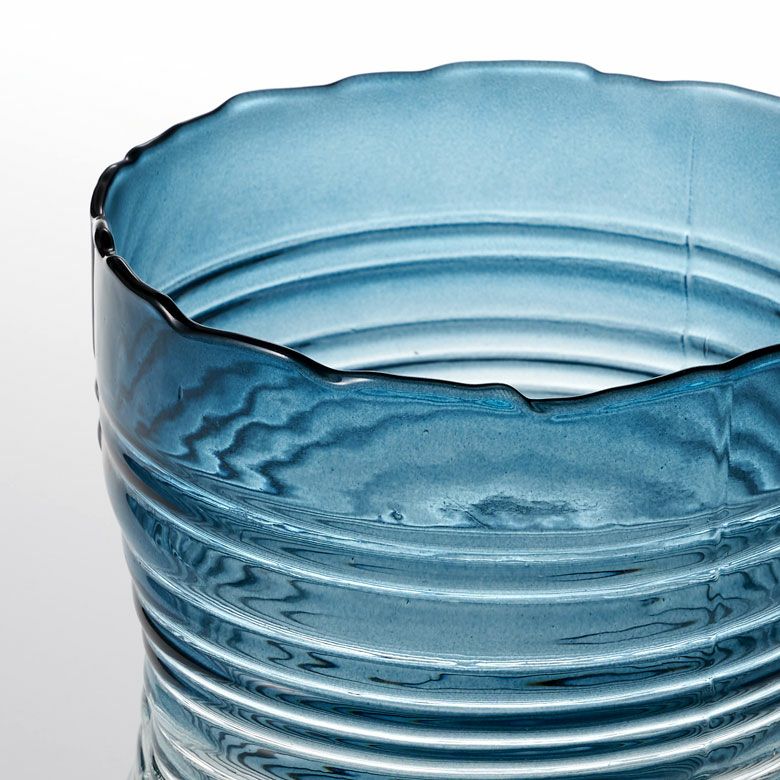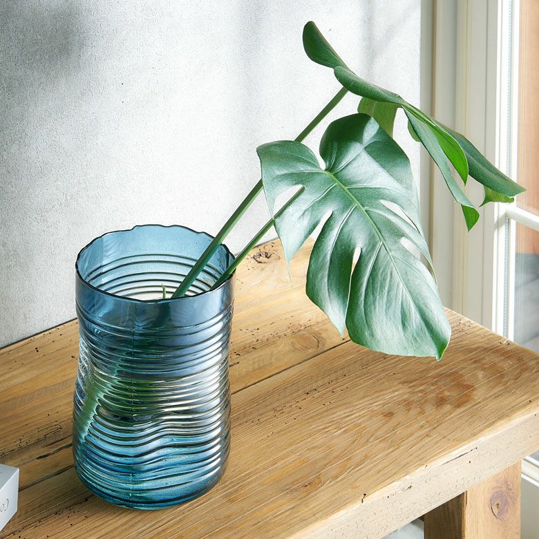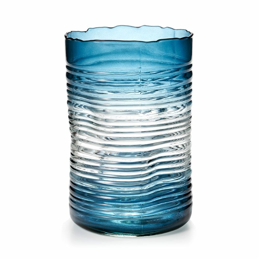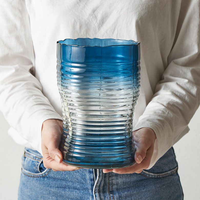 デザイン花瓶 ガラスオブジェ 丸 筒 透明 クリア 青色 フラワーベース ガラス ブルー グラデーション ウェーブデザイン 横縞 上径13.5cm 楕円柱 約 W13.5×D13.5×H20.5 cm 花瓶 花びん 花器 ガラスベース ガラス花びん 生花 ドライフラワー おしゃれ 北欧 韓国 インテリア アジアン 雑貨 アジアン雑貨 [67089]