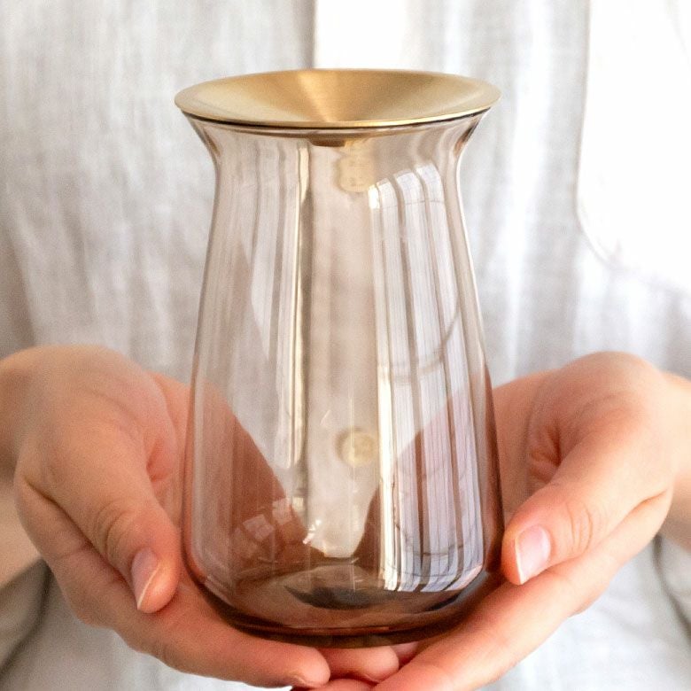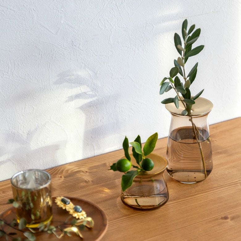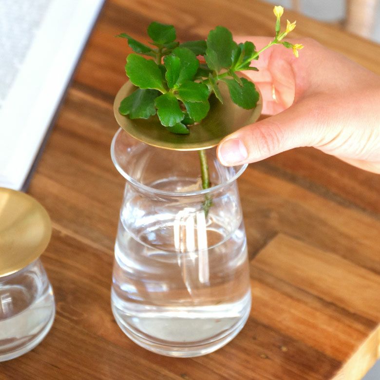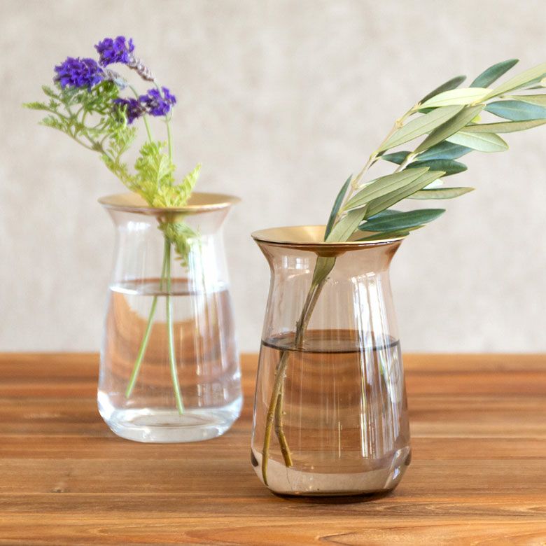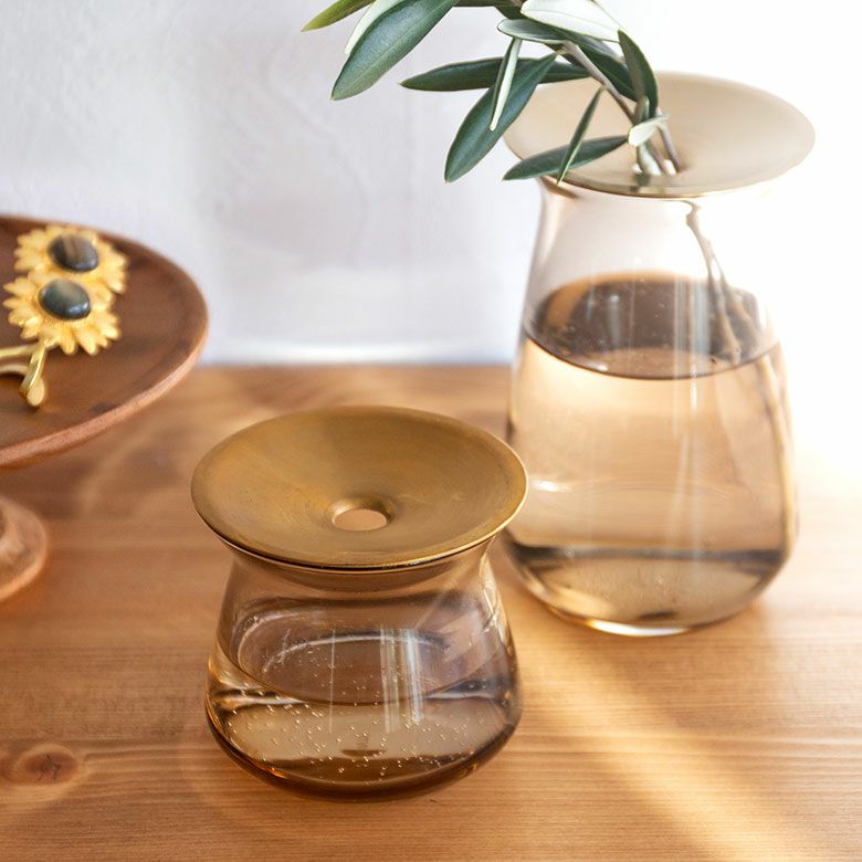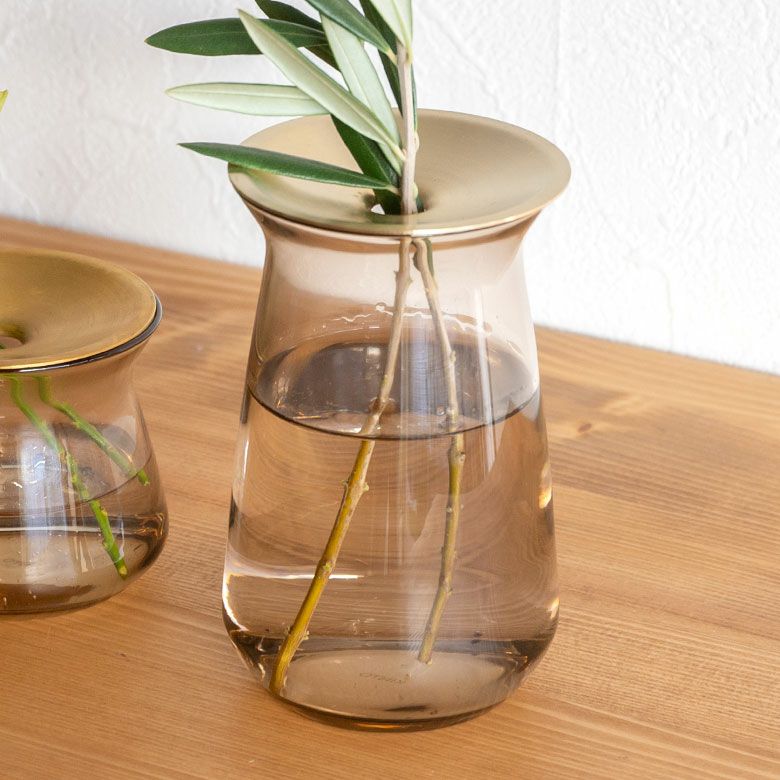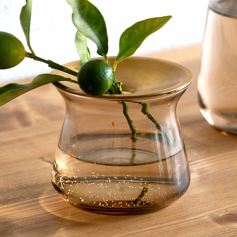 花器 ガラスフラワーベース 観葉植物 ギフト プレゼント 贈り物 フラワーベース 一輪挿し ガラス 真鍮 クリア ブラウン 直径 8cm 高さ 7cm 170ml [90389]【 花瓶 ブラス 小さめ 小ぶり ゴールド ラウンド 水耕栽培 水栽培 ハイドロポニック おしゃれ お手入れ簡単 透明 茶色 KINTO】