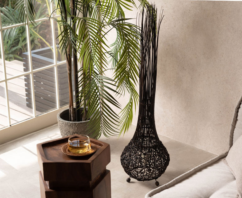 バリ島で生まれたラタンを主素材に、鉄や木を組み合わせたスタンド照明。自然素材ならではの素朴な表情が、空間にリゾート感と開放感をもたらします。ラタン家具やアジアン雑貨と合わせることで、肩の力が抜けたリラックス空間に。