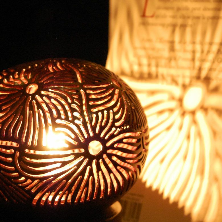 バリの職人がココナッツシェルに繊細なカービングを施した、テーブルランプ。