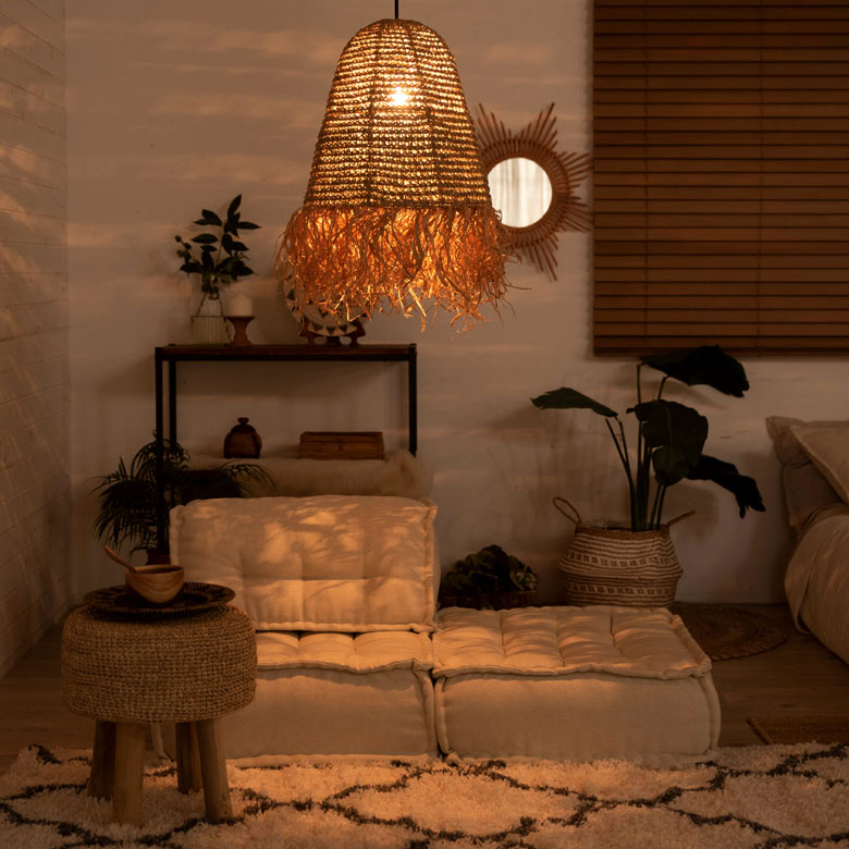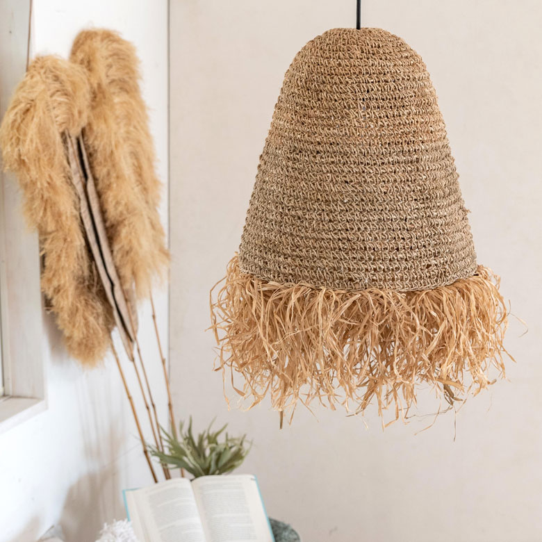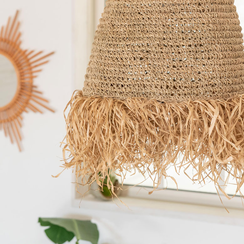 椰子の葉から採れる、ラフィアのフリンジが特徴のペンダントライト。
