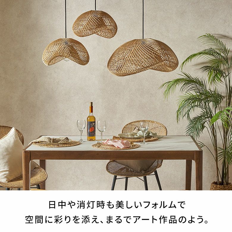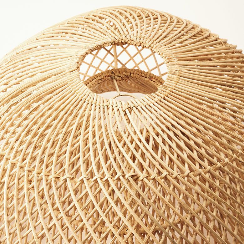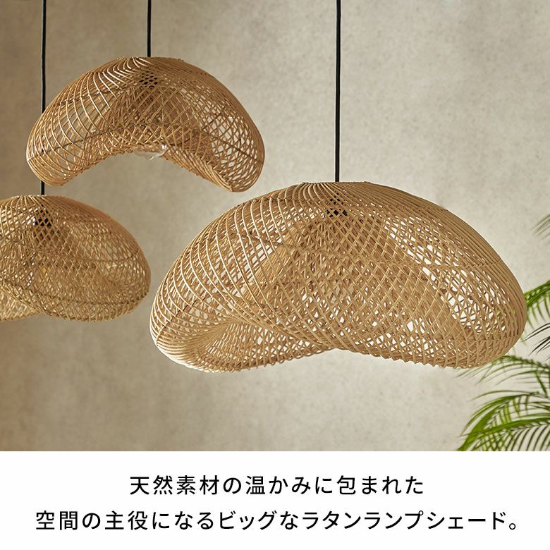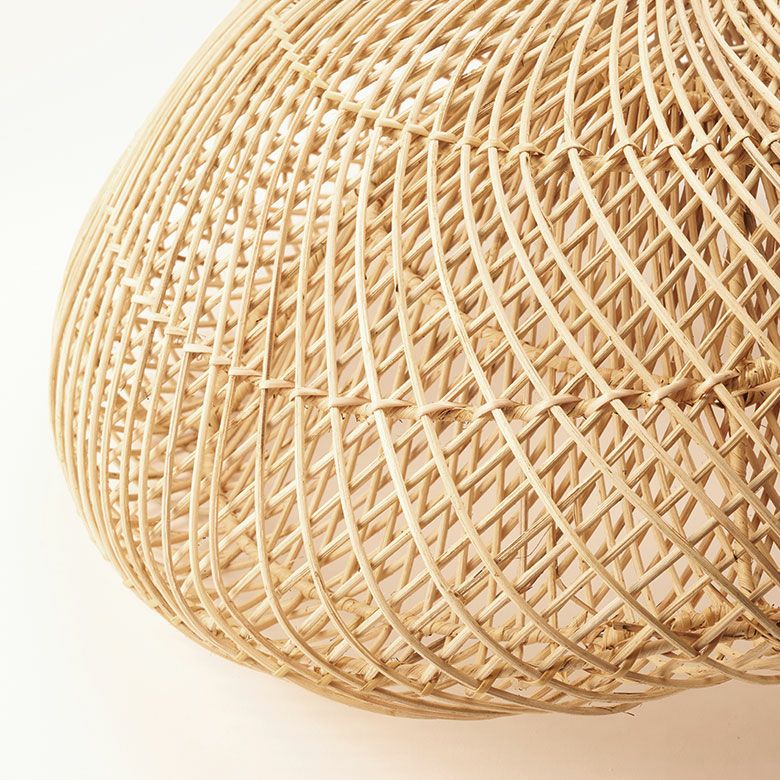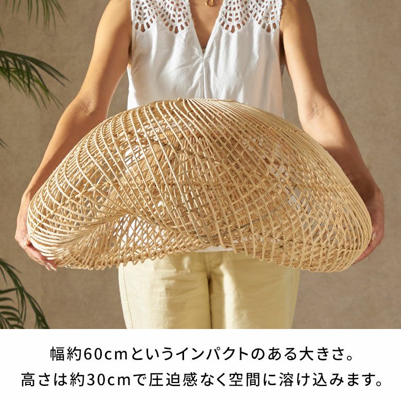 バリ島のラタン職人がひとつひとつ手作業で丁寧に編み上げた、大きなサイズのペンダントランプシェード。耐久性が強くしなやかな天然ラタンを使用し、幅約60cmというインパクトのある大きさながら、高さは約30cmと圧迫感なく空間に溶け込むようデザインされています。天井から吊るせば、まるでふわりと浮かぶ雲のようなやわらかなフォルムが愛らしい、癒しの空間を演出します。