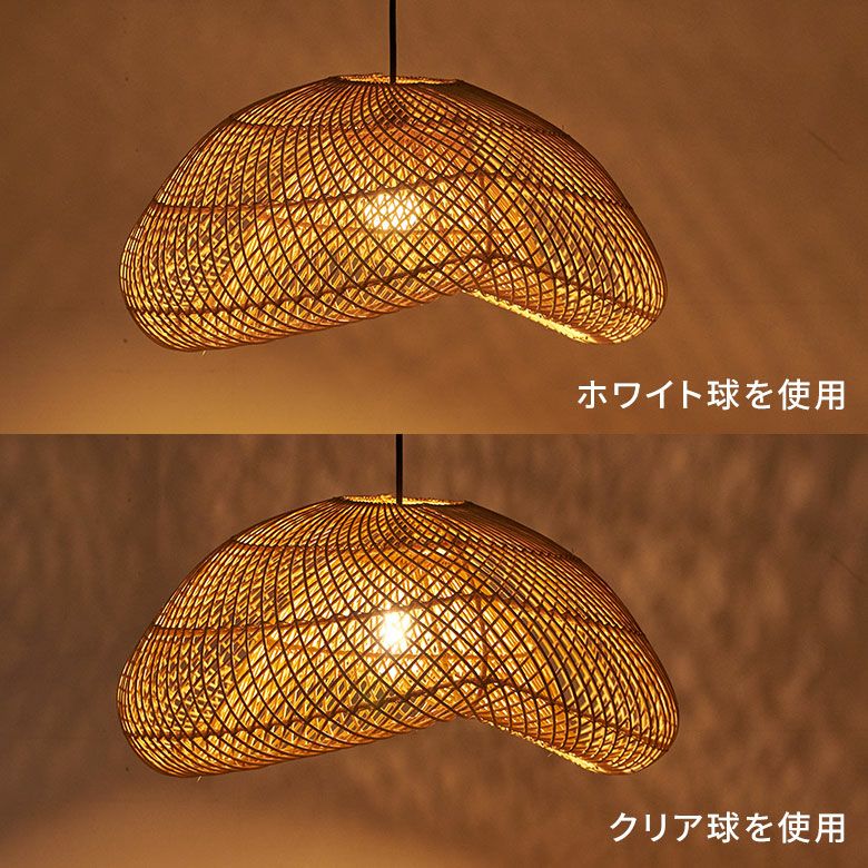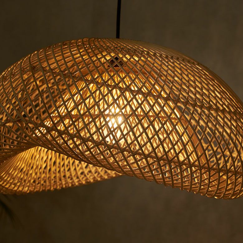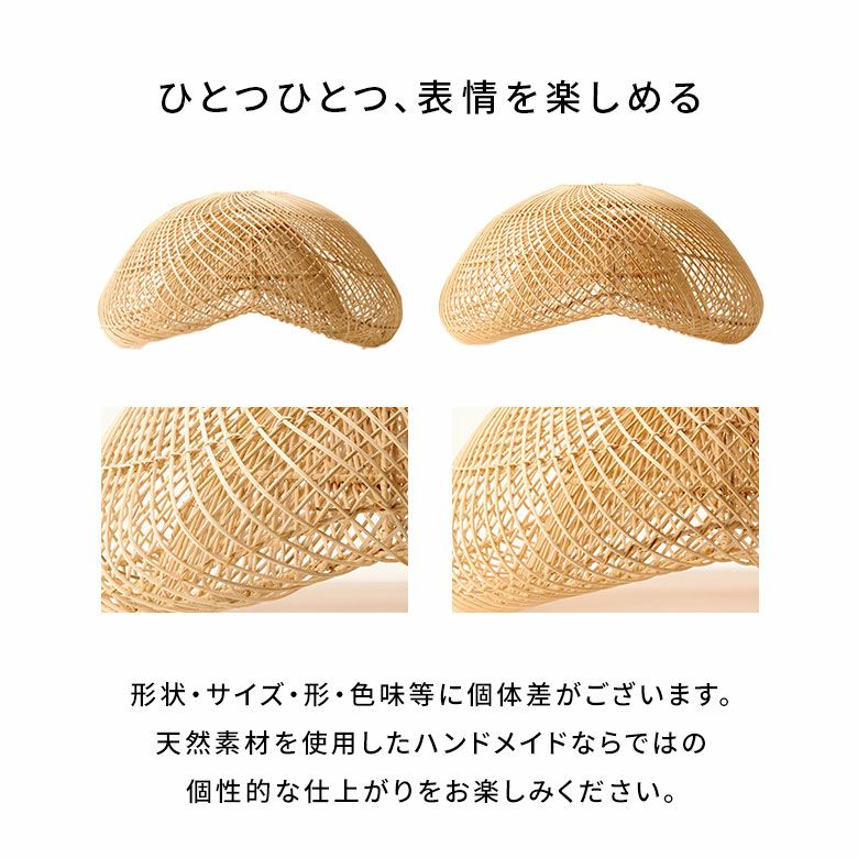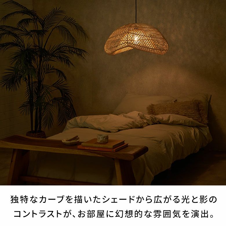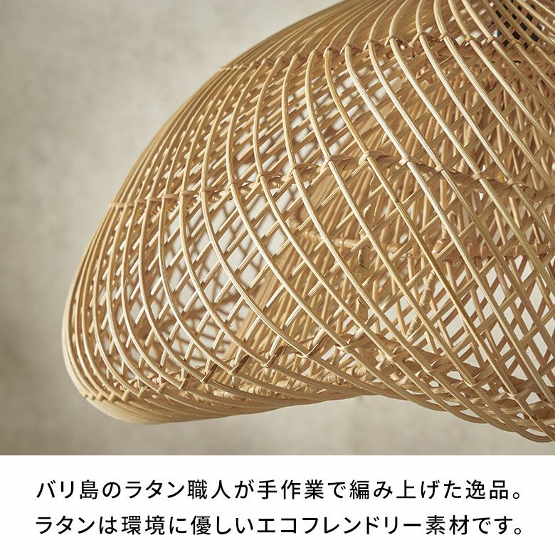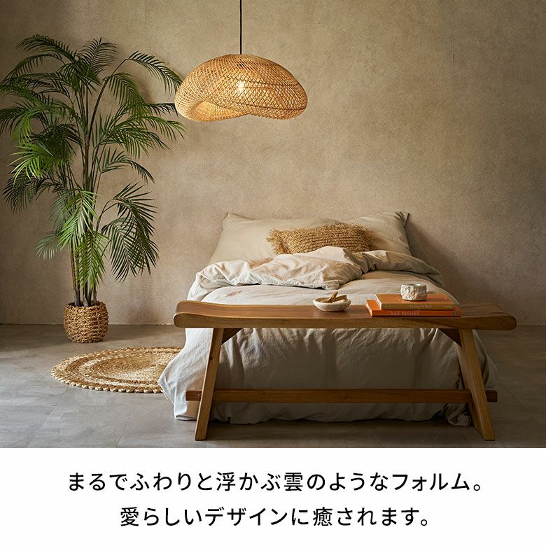 バリ島のラタン職人がひとつひとつ手作業で丁寧に編み上げた、大きなサイズのペンダントランプシェード。耐久性が強くしなやかな天然ラタンを使用し、幅約60cmというインパクトのある大きさながら、高さは約30cmと圧迫感なく空間に溶け込むようデザインされています。天井から吊るせば、まるでふわりと浮かぶ雲のようなやわらかなフォルムが愛らしい、癒しの空間を演出します。