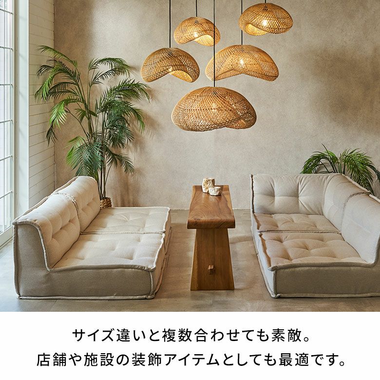 ひと回り小さい同じデザインのランプシェードもございます(上記写真 左上)。ひとつでも存在感抜群ですが、複数個合わせることでさらにリゾート感もアップ。より魅力的な奥深いコーディネートが楽しめるのでおすすめです。