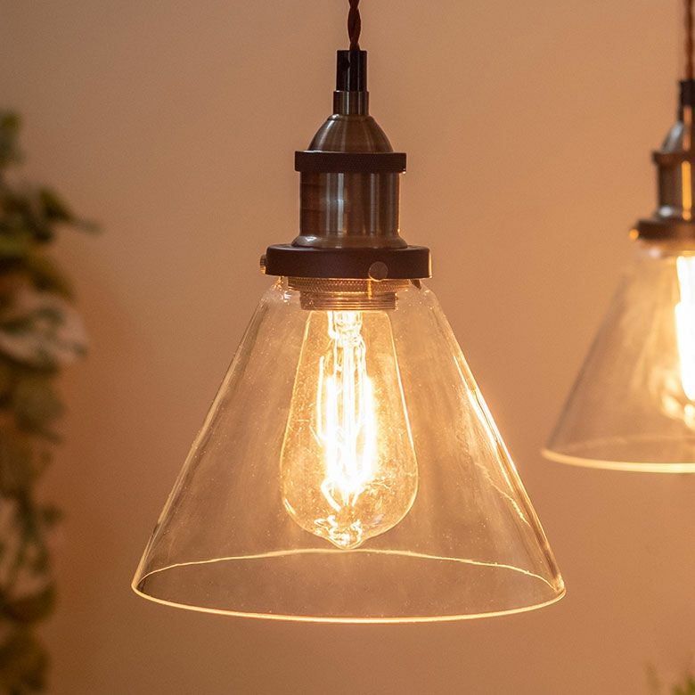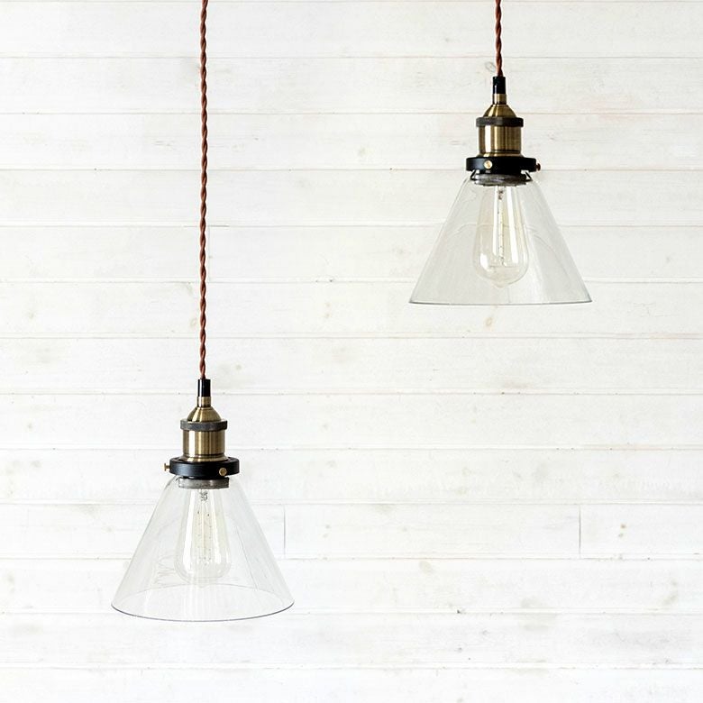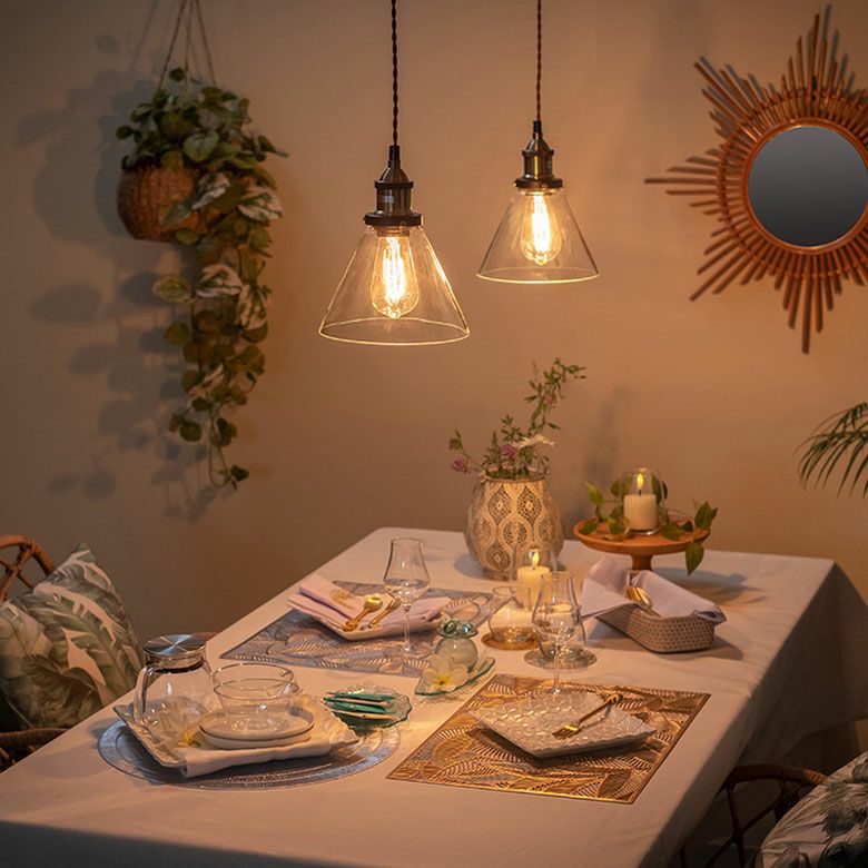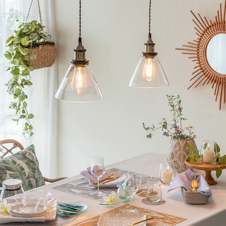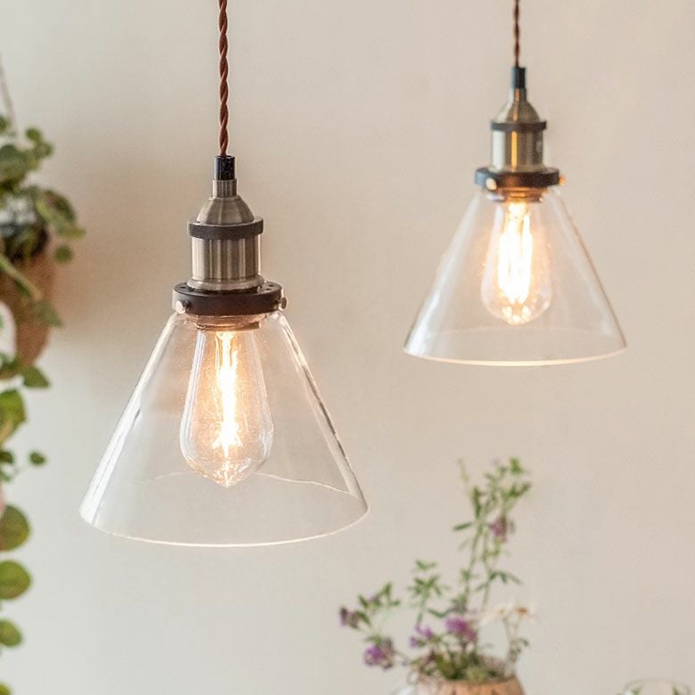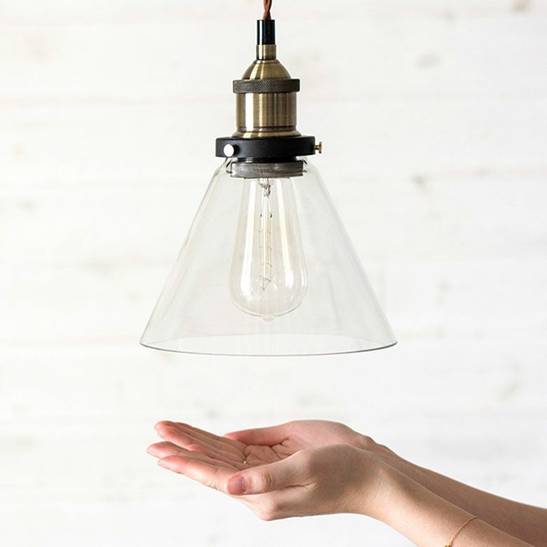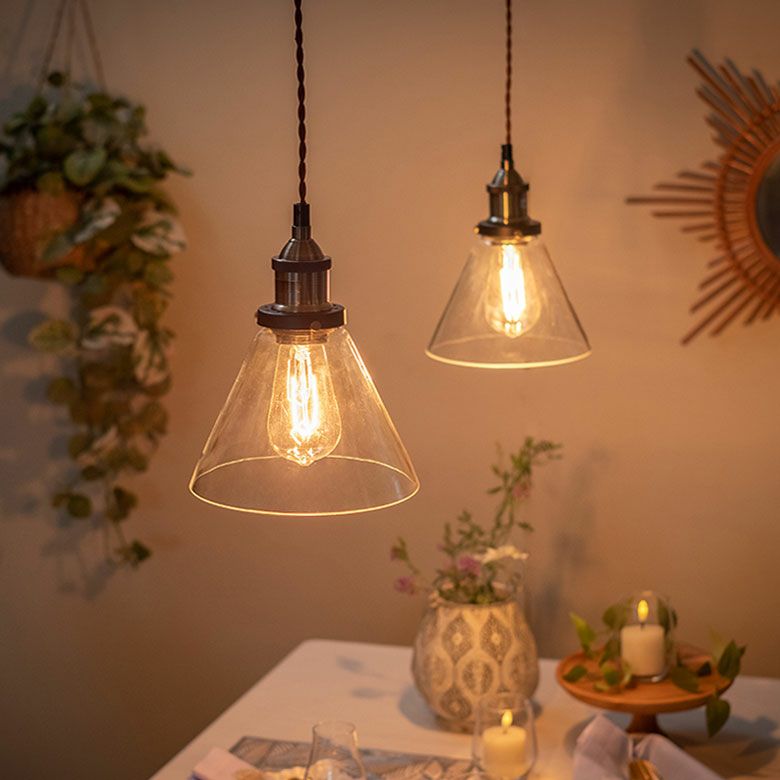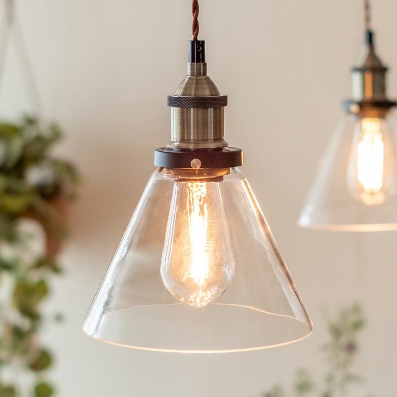 包み込むような傘型のガラスシェードを透してレトロな電球が灯ります。
