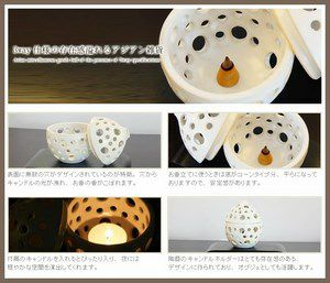 | 独特のデザインが特徴的な陶器で出来たキャンドルホルダーは表面の穴から光が洩れて穏やかな気持ちにしてくれます。 さらにはコーンタイプのお香を中に入れて穴からお香の香を楽しめるお香立てにも使えます。陶器でできているので 重厚感があり、その表面のデザインからオブジェとしても存在感溢れるアイテムになっております。 | ||||