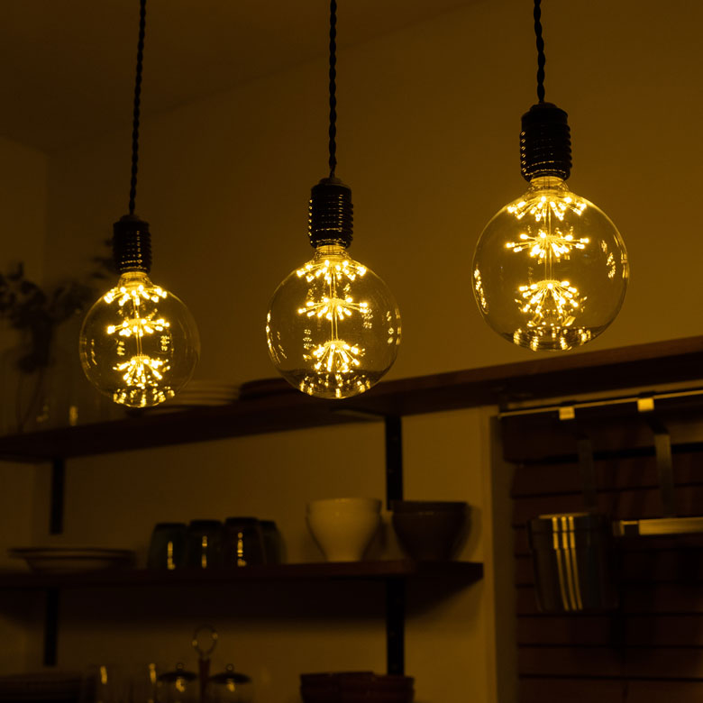LEDの小さな光がたくさん集まって、花火を散らしたように輝くユニークな電球。