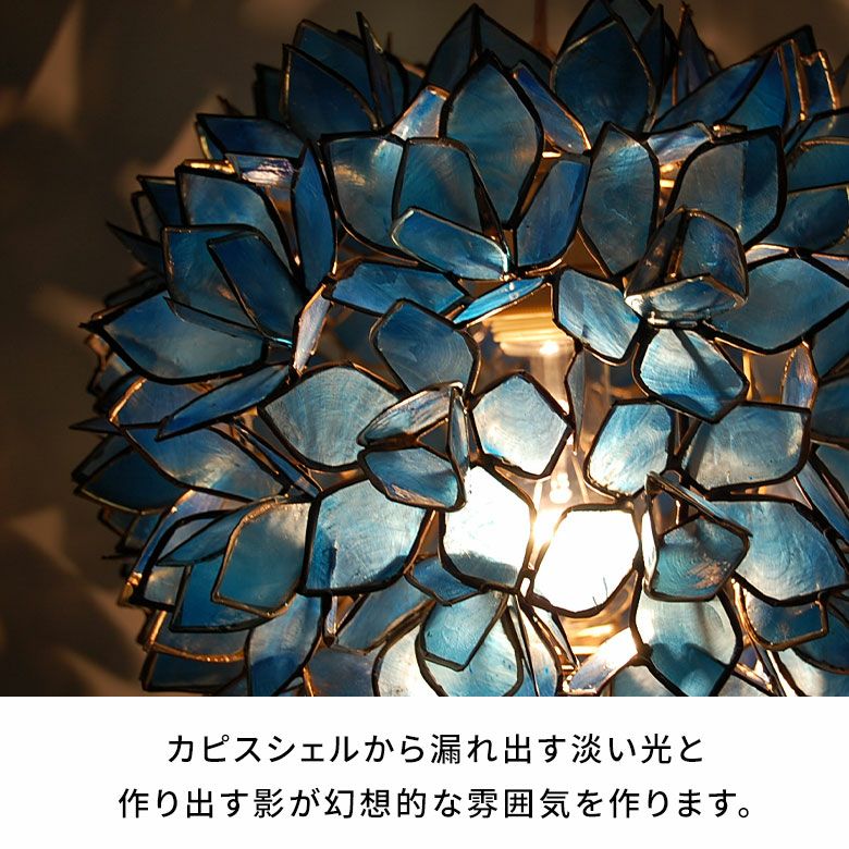 ペンダントランプ オブジェ 家具 インテリア 雑貨 店舗 ホテル シーリング LED電球対応 かわいい フラワーモチーフ ダイニング ベッドルーム 居間 引越し バリ プレゼント ギフト お祝い ランプシェード インテリア照明 デザイン照明 吊り下げライト 吊り下げ照明 シェードランプ 天井ランプ ペンダントライト ブルー リビング 寝室 おしゃれ モダン W 28cm D 28cm H 20cm - 23cm 貝殻 カピスシェル 天井照明 間接照明 照明器具 ライト ランプ アジアン [4353]