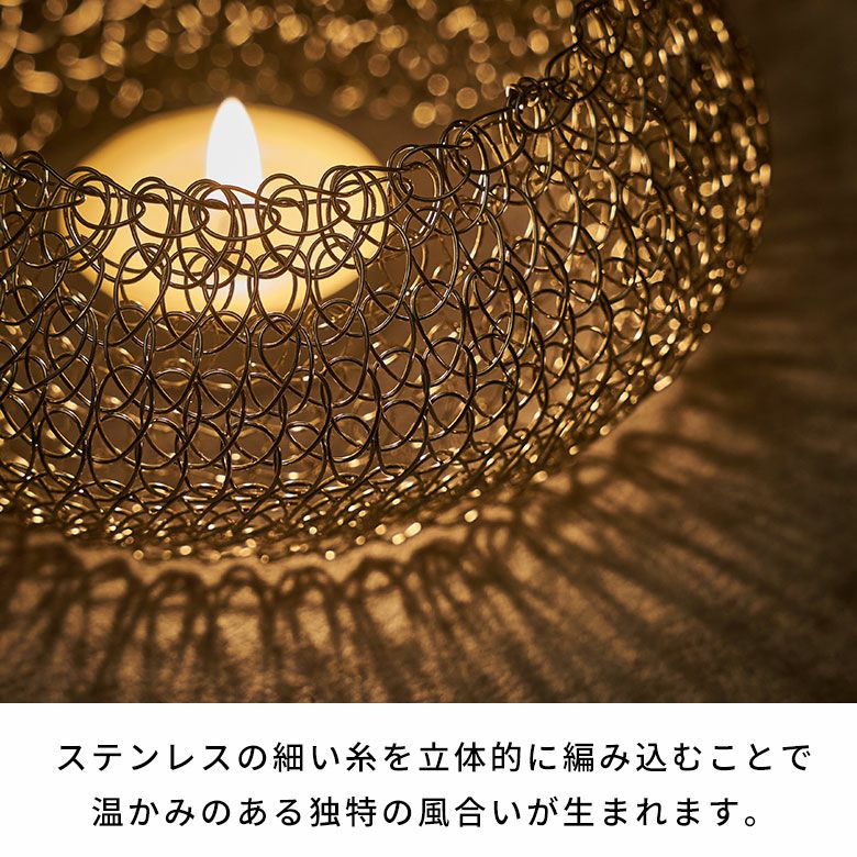 バリ島の熟練職人が手作業で編み上げた、唯一無二のキャンドルホルダーです。ステンレスの細い糸を立体的に編み込むことで、温かみのある独特の風合いが生まれます。型を使わず、すべての工程を手作業で仕上げるため、同じものはふたつとなく、アート作品のような存在感が魅力です。