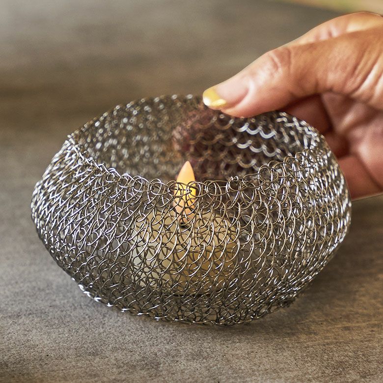 非常に細かな編み目をつなげる作業には、熟練の技術と根気が必要で、工業製品にはない深みと温もりを感じさせます。有機的なデザインはキャンドルの光を美しく引き立て、ティーライトキャンドルの魅力を格上げします。