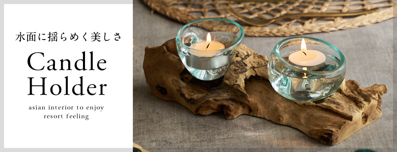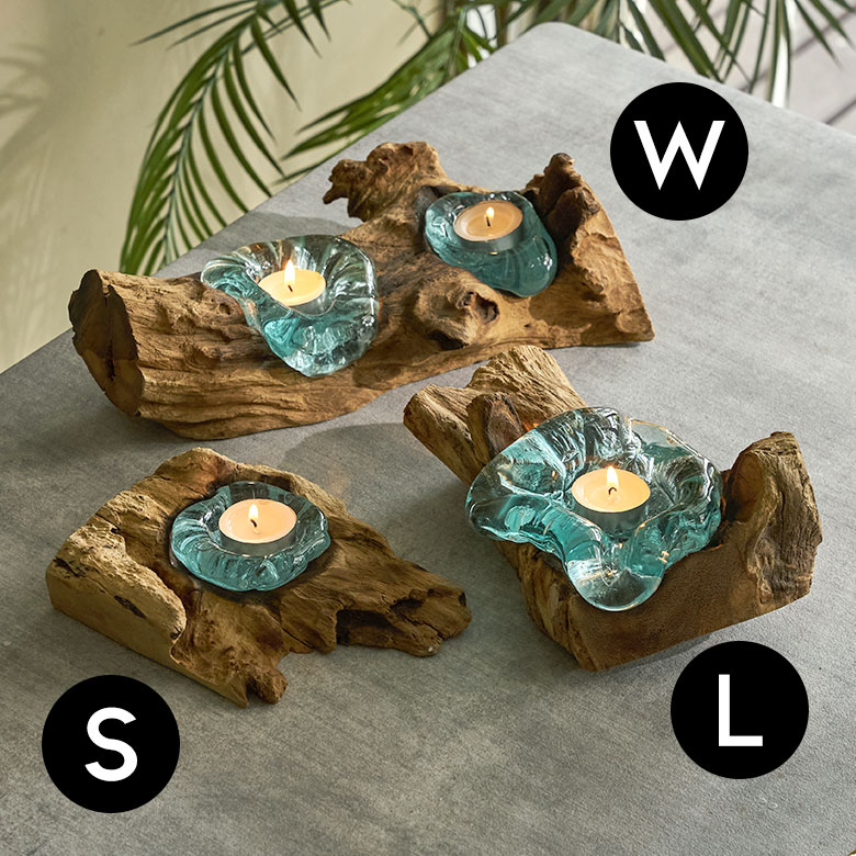 バリ島の熟練の職人が、ひとつひとつ形の異なる木材にリサイクルガラスを流し込み丁寧に仕上げられたキャンドルホルダーは、同じものはふたつとないまさに一点もののアイテムです。バリ島の海の浅瀬を思わせる淡いブルーのリサイクルガラスは、 優しいカラーと、ぽってりとした厚みのあるフォルムが魅力。天然素材とリサイクル素材からできたサステナブルなデザインは、環境に優しいだけでなく、美しいアクセントとして空間に溶け込みます。