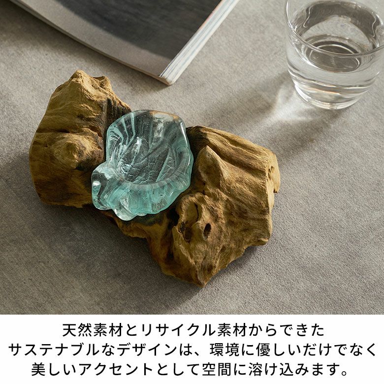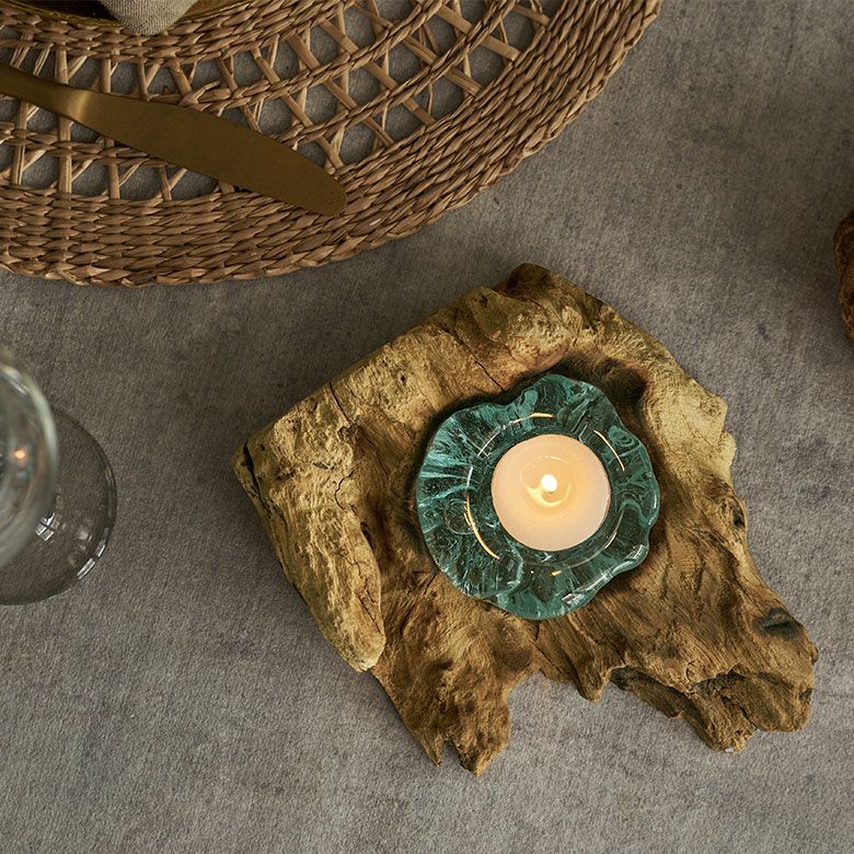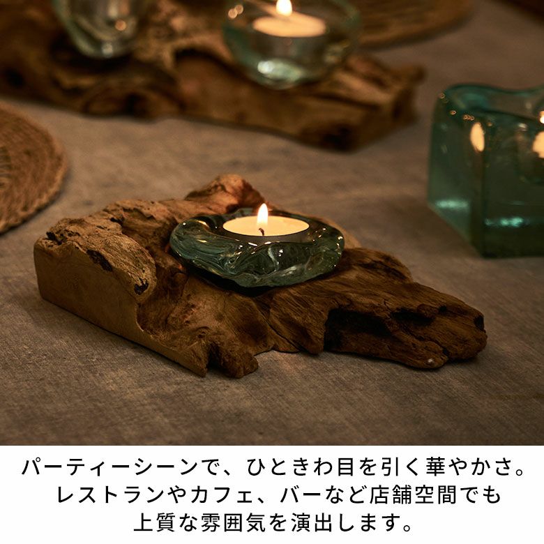 古木の自然な造形と職人の技が織りなす、古木×リサイクルガラスのキャンドルホルダー。
