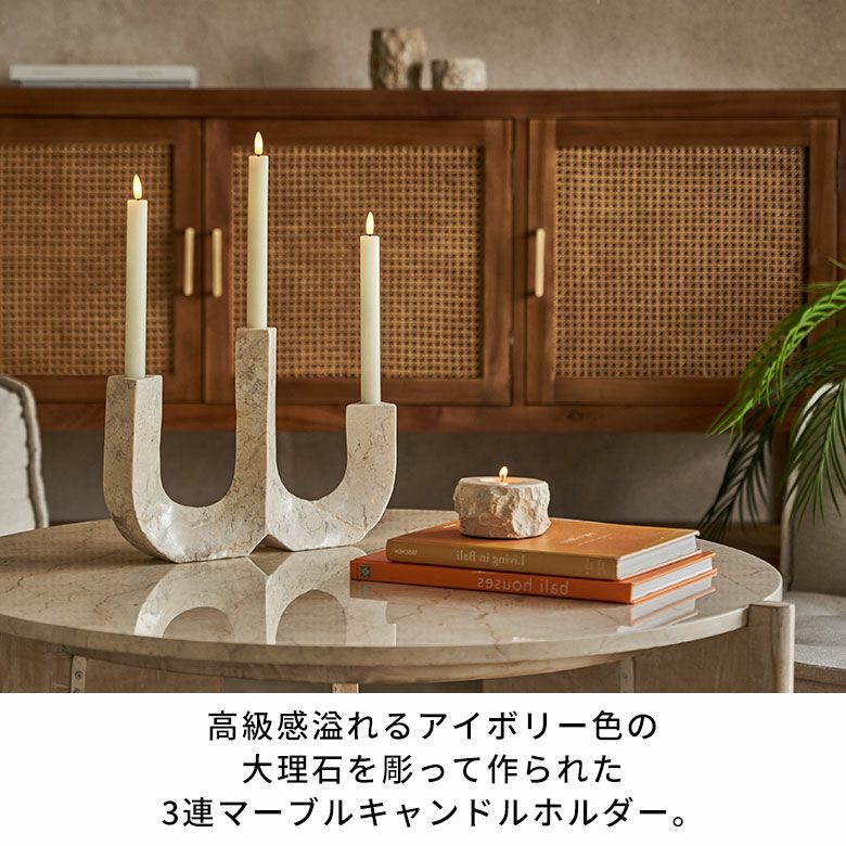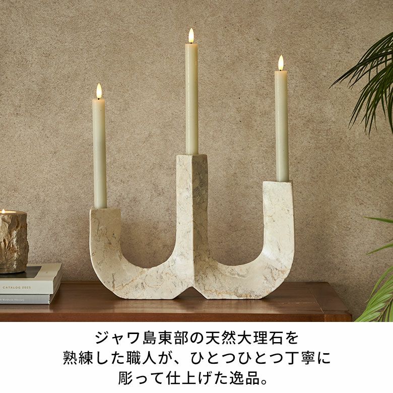 ジャワ島東部の天然大理石を熟練した職人が、ひとつひとつ丁寧に彫って仕上げた3連キャンドルホルダー。