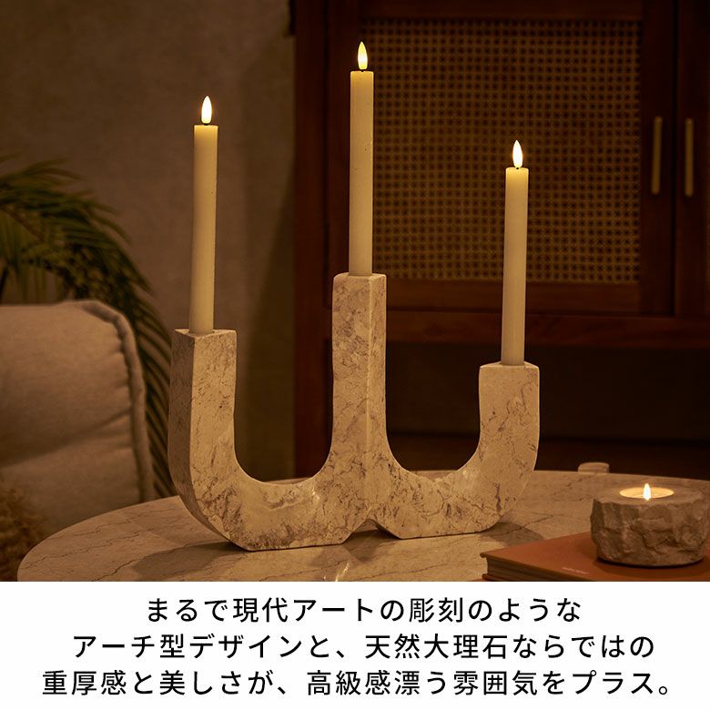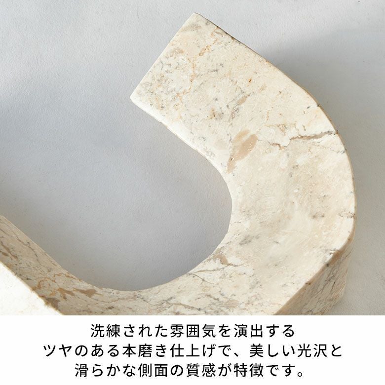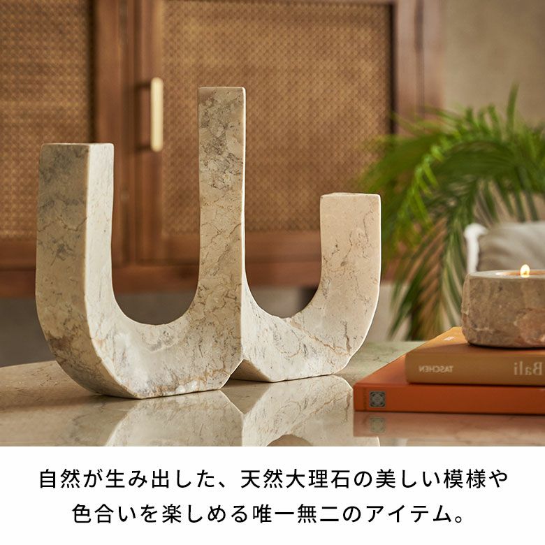 洗練された雰囲気を演出するツヤのある本磨き仕上げで、美しい光沢と滑らかな側面の質感が特徴です。自然が生み出した天然大理石の美しい模様や色合いを楽しめる唯一無二のアイテムです。まるで現代アートの彫刻のようなアーチ型デザインと、天然大理石ならではの重厚感と美しさが、高級感漂う雰囲気をプラス。耐久性が高く、エシカルで長く愛用できる魅力的なキャンドルホルダーです。