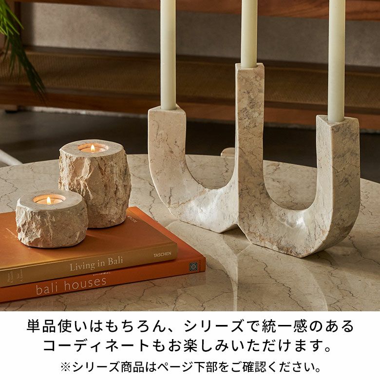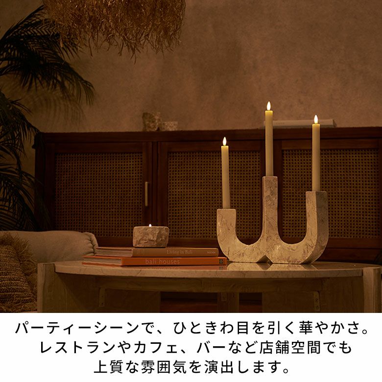 キャンドルを灯して優雅な癒しの空間をお楽しみいただけるのはもちろん、置いておくだけでインテリアオブジェとしても存在感を放ちます。パーティーシーンでも、ひときわ目を引く華やかさ。レストランやカフェ、バーなど店舗空間でも上質な雰囲気を演出します。天然大理石の素材そのものの魅力が引き立つ洗練されたキャンドルホルダーは、ワンランク上のアジアンリゾートのような雰囲気を演出します。
