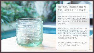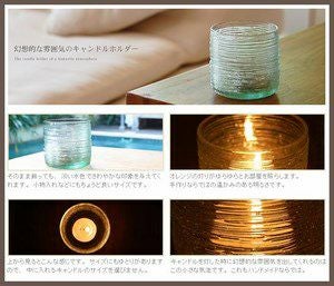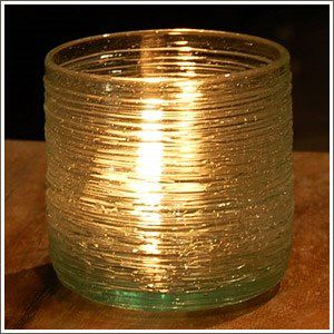 淡い水色がかったガラスで作られたキャンドルホルダーカップ。 ハンドメイドで作られた厚みのあるカップの表面に溶かしたガラスを糸のように細く 巻きつけることで、キャンドルを灯した時に美しいシルエットが生まれます。 巻きつけられたガラスの糸が滑り止めになって持ちやすさもアップしています。 たまには明かりを落としてろうそくの明かりでキャンドルライトディナーを楽しんでみませんか。 いつもの夕食がまるでレストランのディナーのようになりますよ。 |