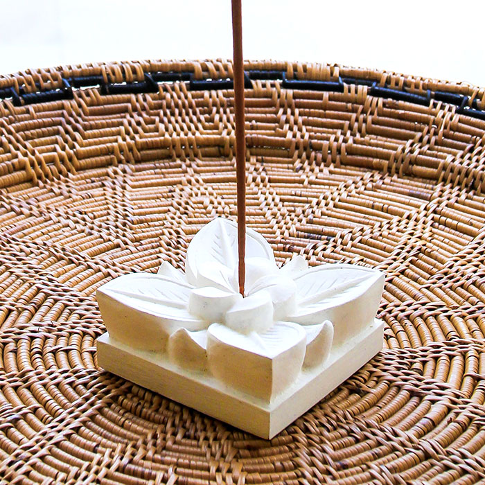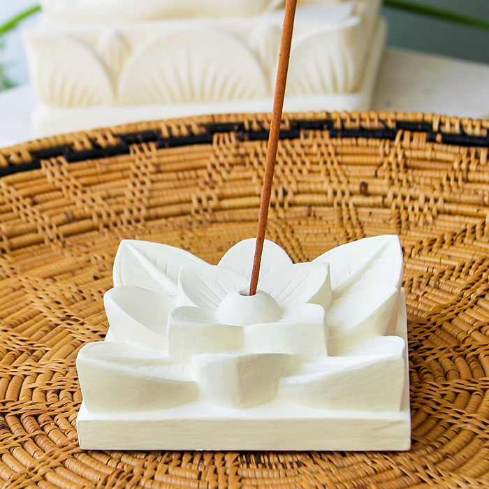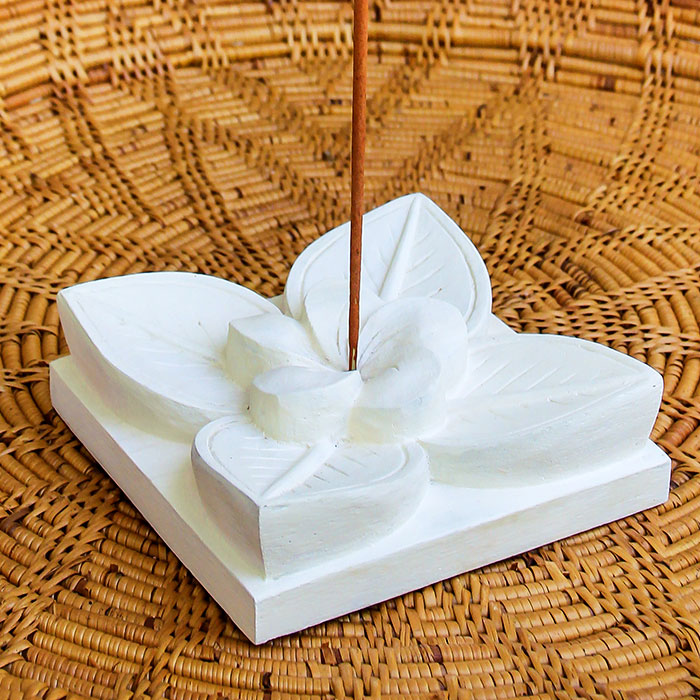 | パラス石を彫って作ったお香立てはスティックタイプのお香が使えます。プルメリアの花の中央に穴がありますのでそこから挿してお使い頂けます。こちらのお香立てとして使わない時もオブジェのようにお部屋のアクセントになります。くつろぎのリラックスタイムをお気に入りのお香と素敵なお香立てで演出してみませんか? |