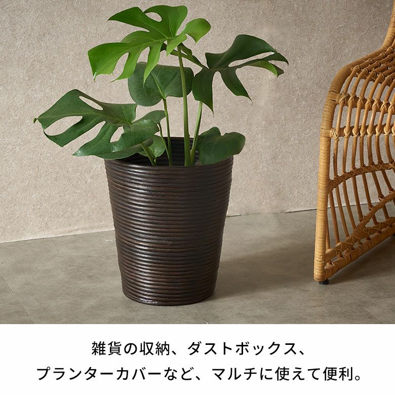 フタ無しでも使っても、アイデア次第でマルチに役立ちます。プランターカバーにもぴったりで、天然素材の風合いでグリーンをより魅力的に引き立てます。(7号鉢サイズに対応)