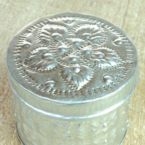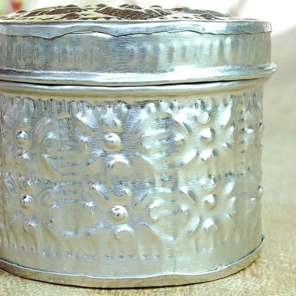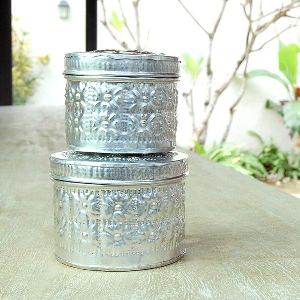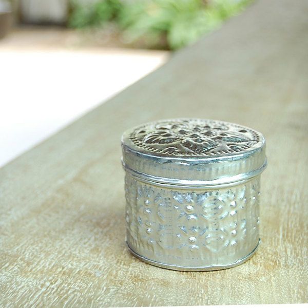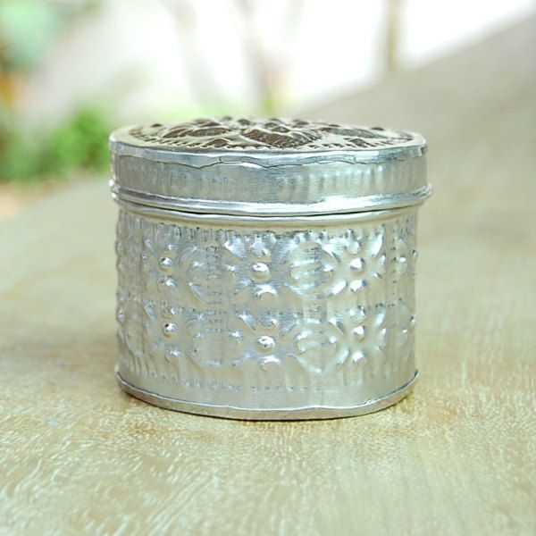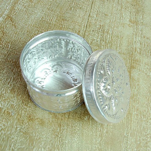 アジアンな模様が全面に施された、アルミの小物入れ。