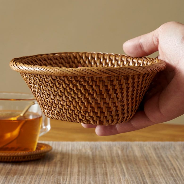 そのラタンを細く切ったものをカゴ状に編んで出来たのが、こちらのアイテム。