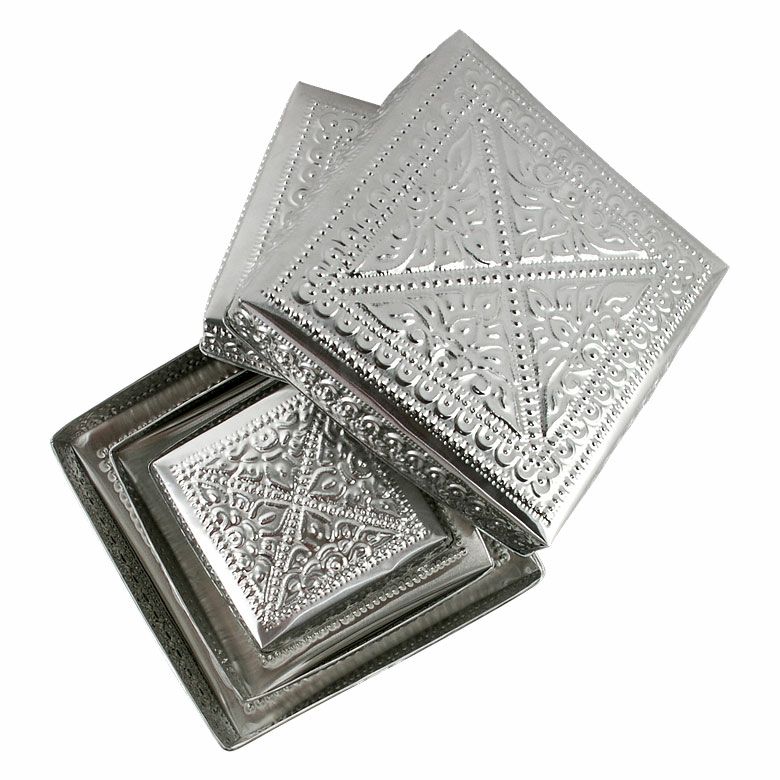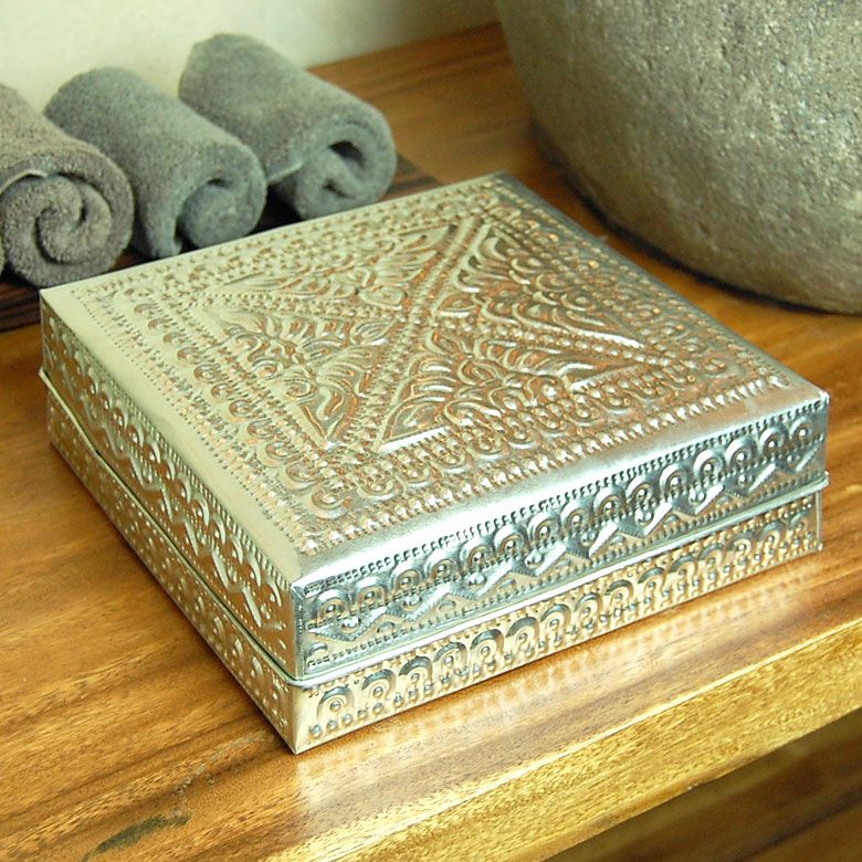 | 細かな模様の装飾が施されたハンドメイドの温もりも感じるアルミ製小物入れ。 シンプルな正方形の形をしていて、高さが低めで小物を取り出しやすいケース。 オリエンタルな雰囲気が漂っていて、そのままオブジェとして置いても、オシャレで華やかにお部屋を飾ってくれますよ。 サイズはLサイズ,Mサイズ,Sサイズをご用意しております。3つを入れ子にして1つに収納することも可能なんです♪ 重ねて飾っても、1つにまとめても可愛いですね☆ このアルミ製小物入れで可愛く収納してみませんか。 | ||||
