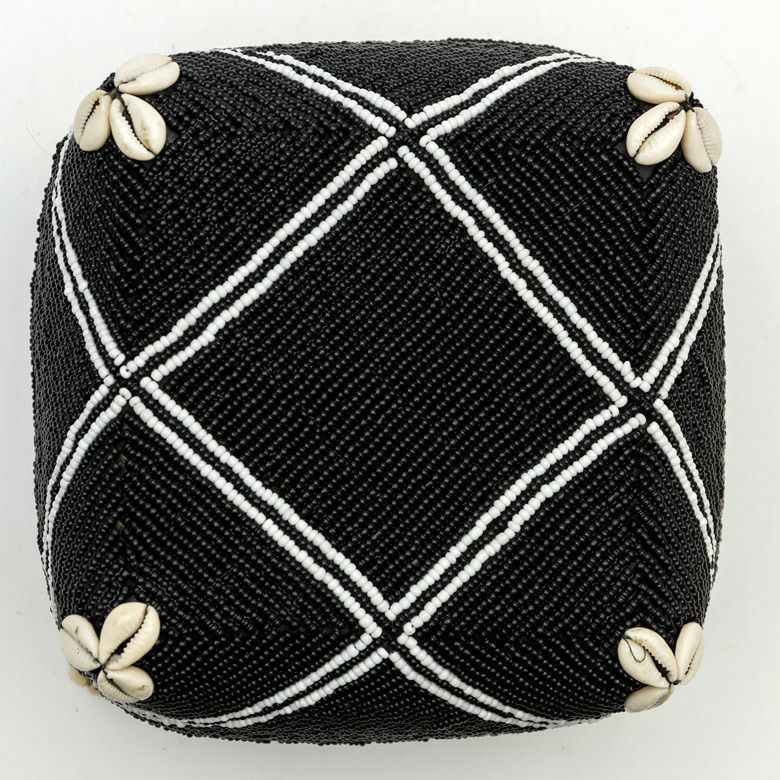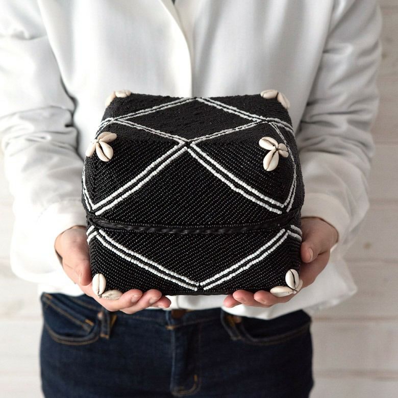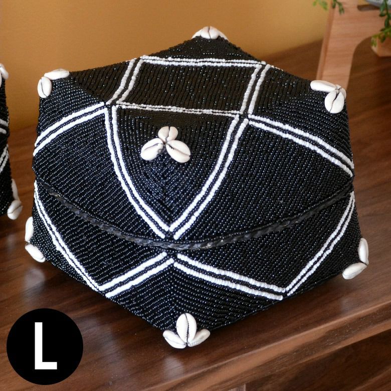 手作業で竹のスライスを編み、贅沢に底以外の全面をビーズで