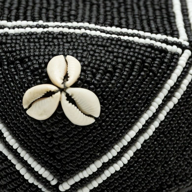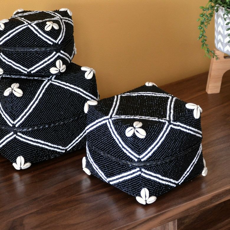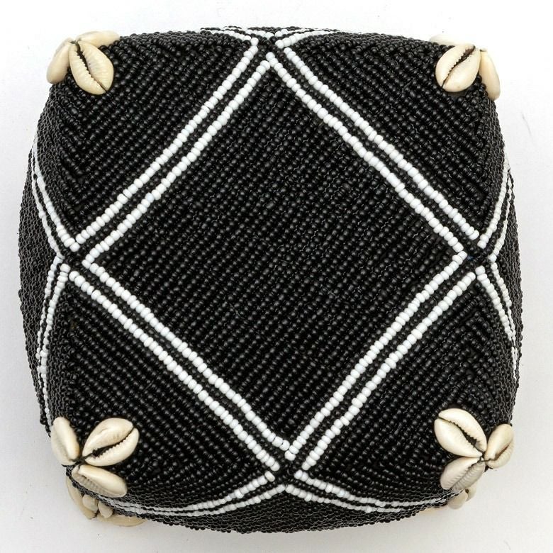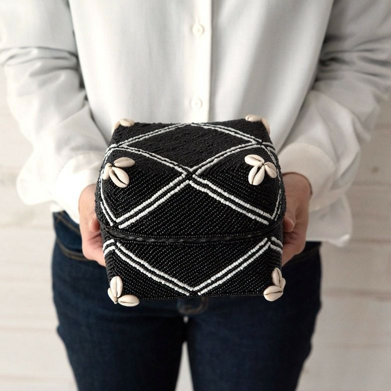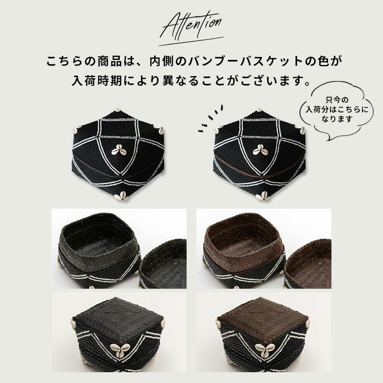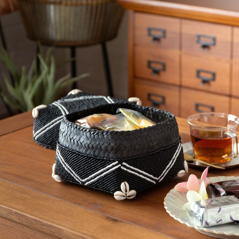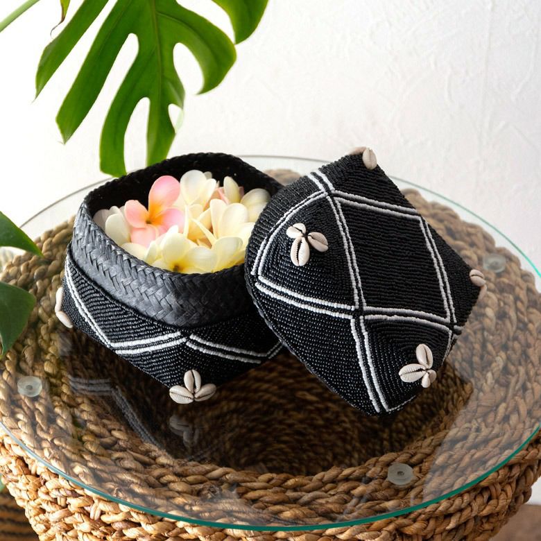 手作業で竹のスライスを編み、贅沢に底以外の全面をビーズで
