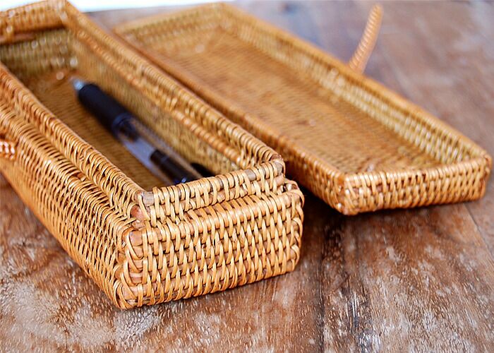 アタと呼ばれるツタ状の植物で編まれた長方形のペンケース。 バリ島のトゥガナン村に住む熟練の職人が作り出すアイテムは手作業で生み出す細かい編み目と天然素材のやさしい肌触りが特徴。 フタについているベロを穴に通して固定する仕組みです。 使い勝手のいい長方形なので、ペンケースとしてはもちろんスティックタイプのお香ケースとしても使えます。