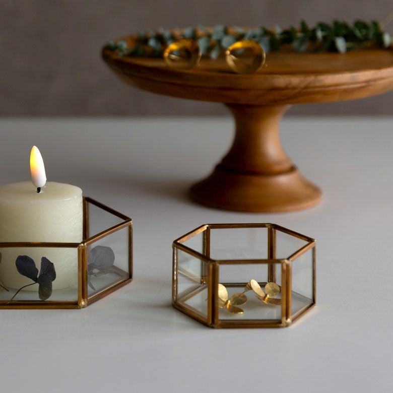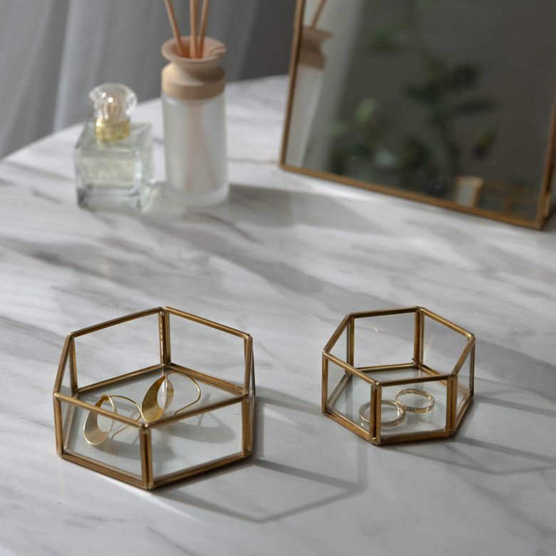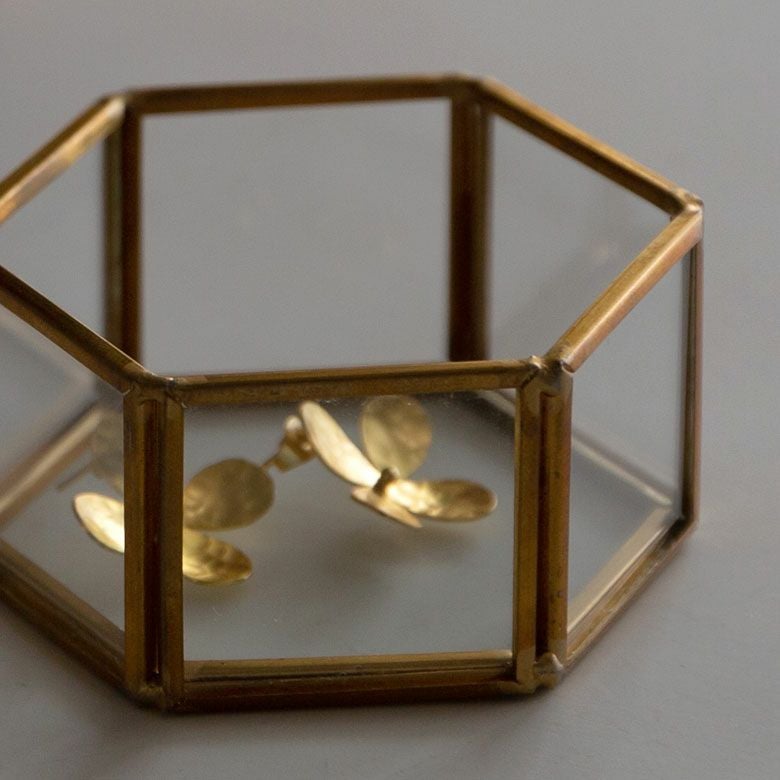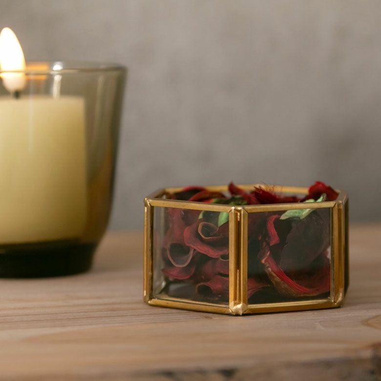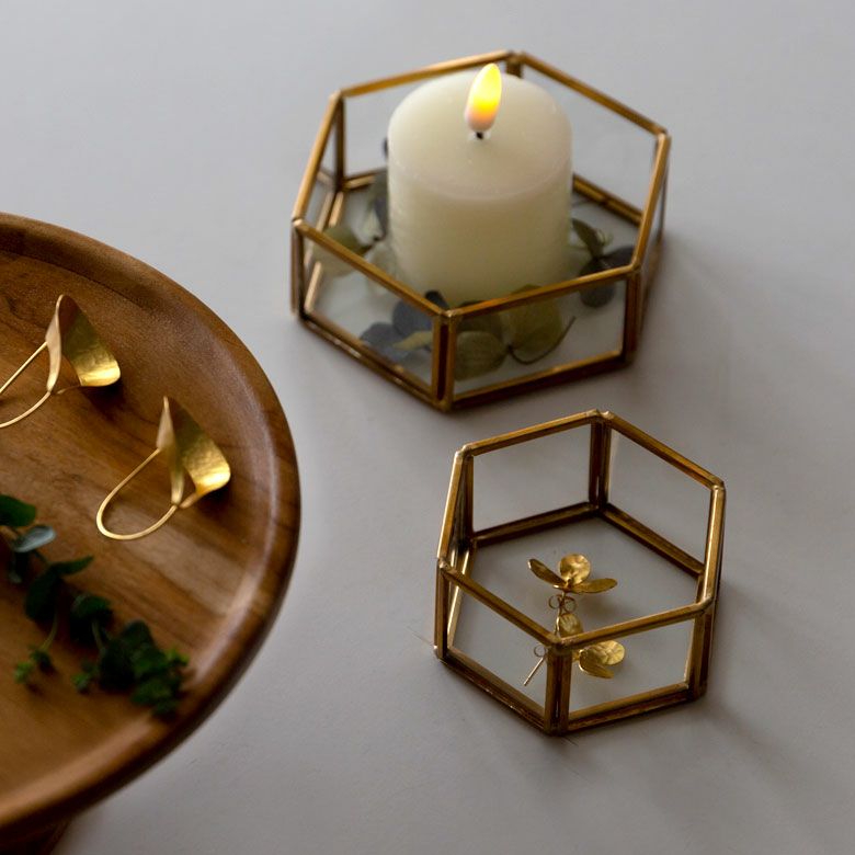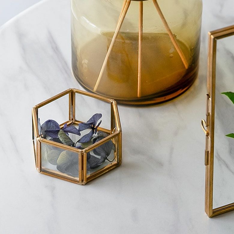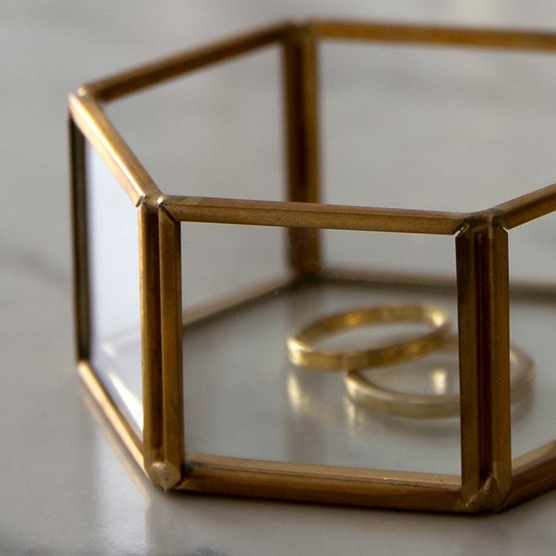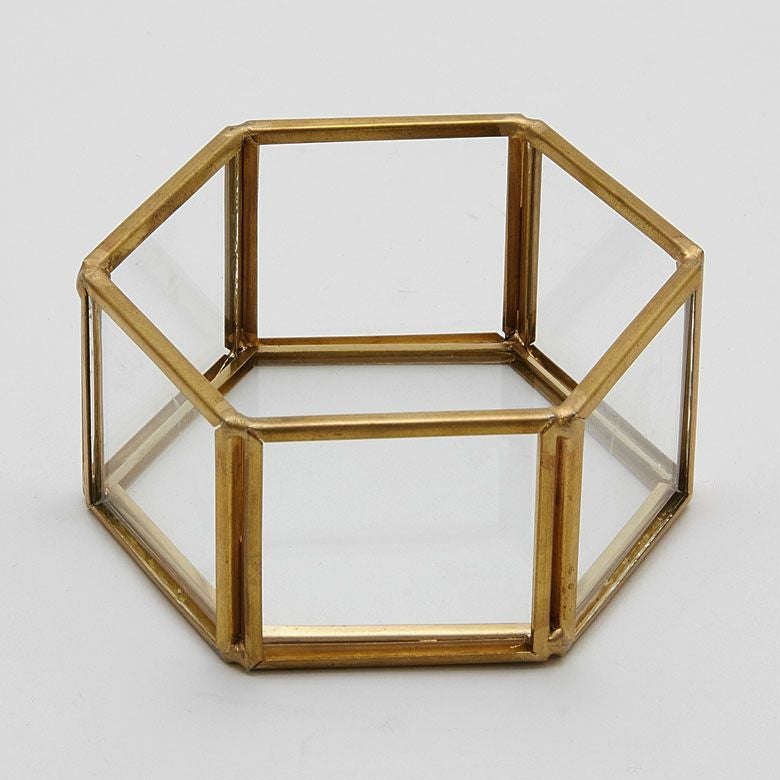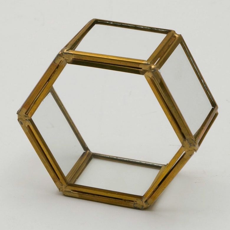 六角形の真鍮製フレームで、側面と底面はガラス張りです。