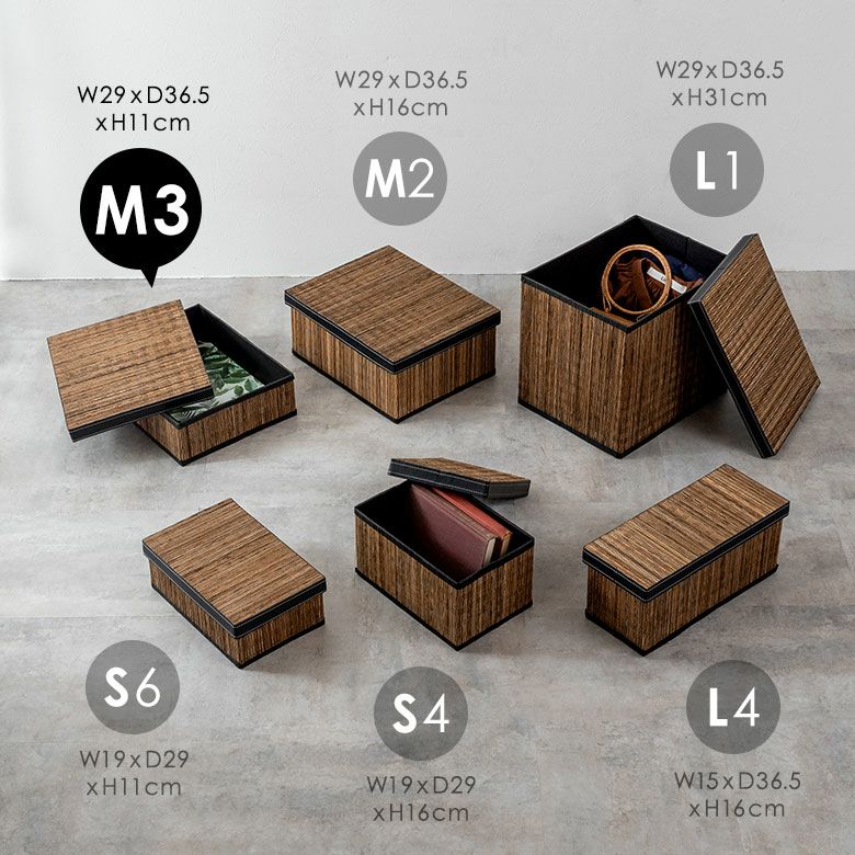 お部屋の収納スペースに合わせて使えるよう 6サイズ展開。 サイズによって用途を変えて、お部屋を スッキリ整頓できます。 モジュール型のボックスだから、組み合わせパターンが無限大!