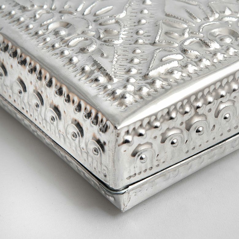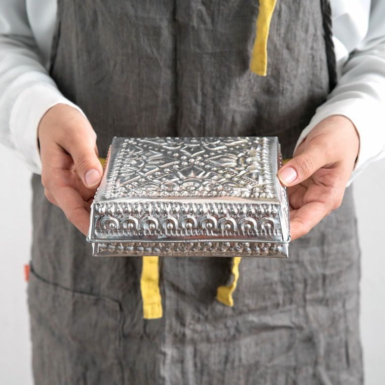 アジアンな模様が全面に施された、アルミの収納ケース。