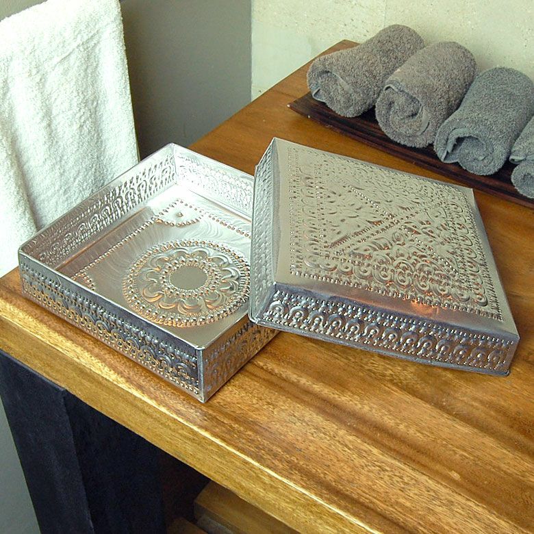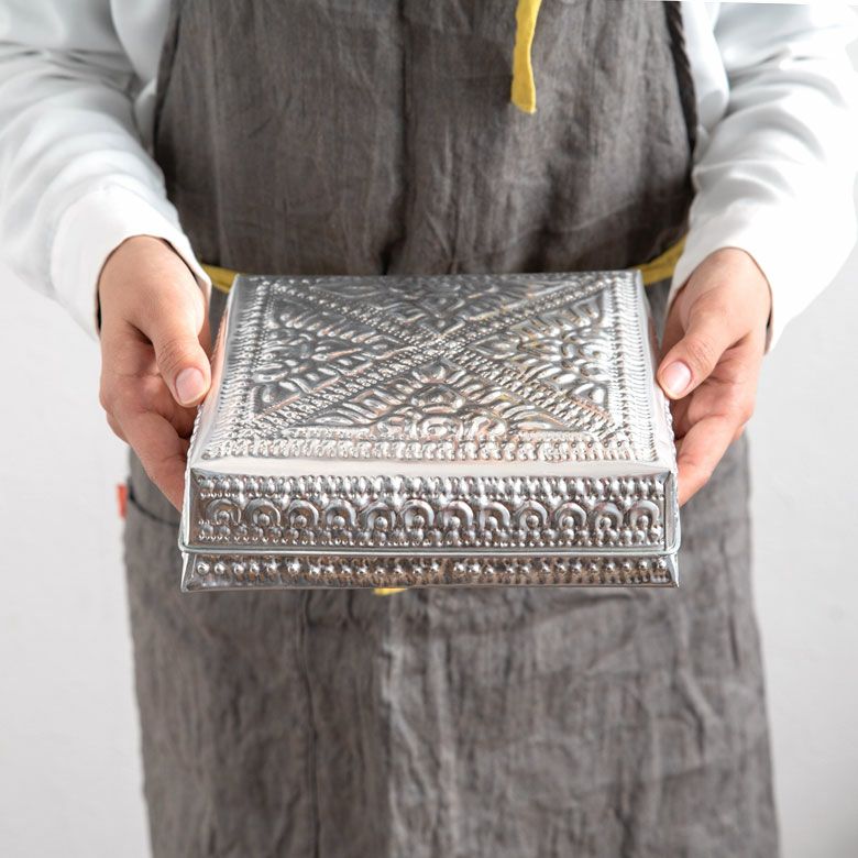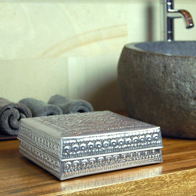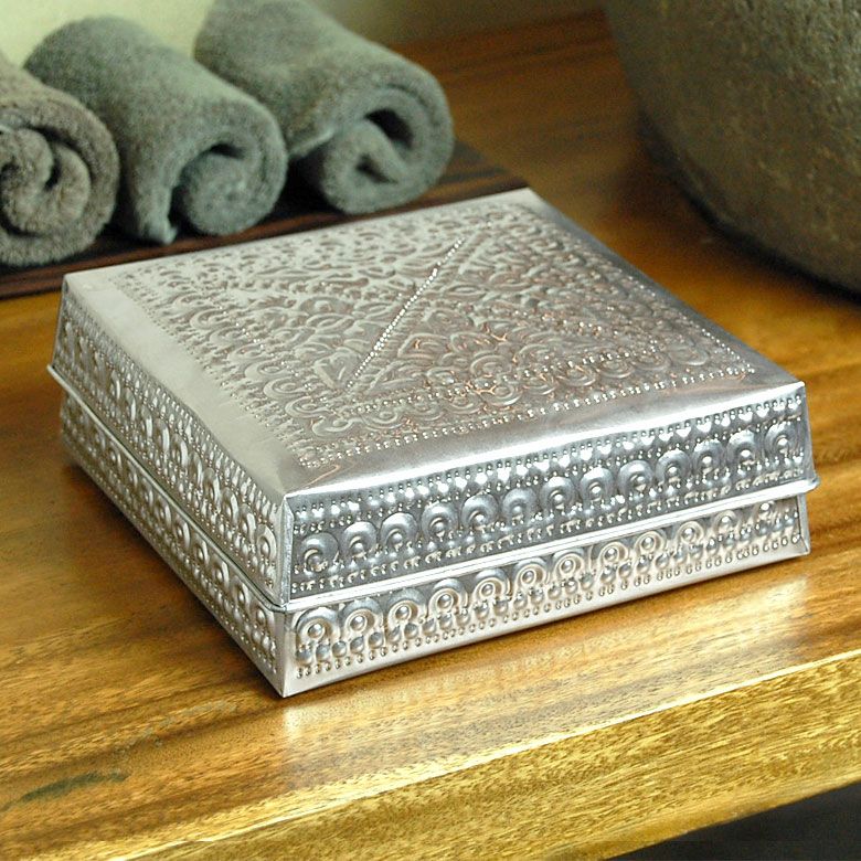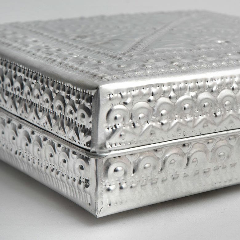 アジアンな模様が全面に施された、アルミの収納ケース。