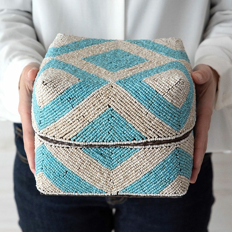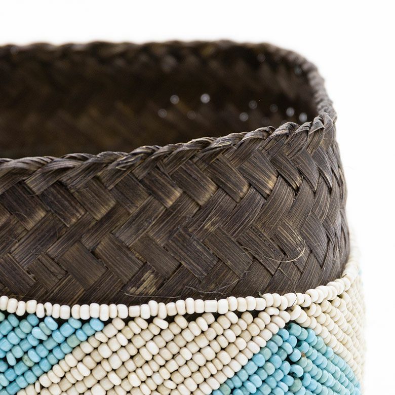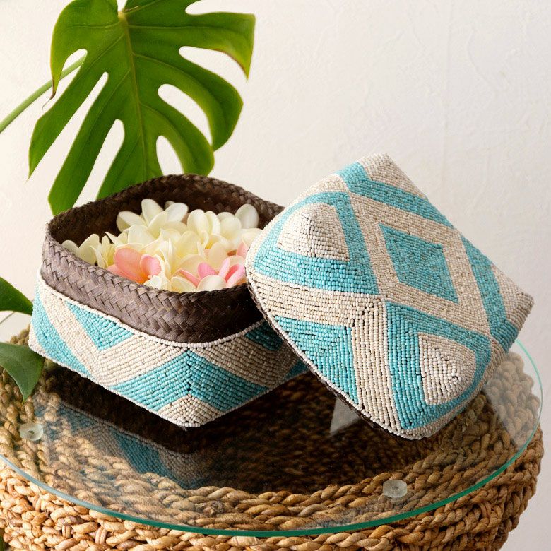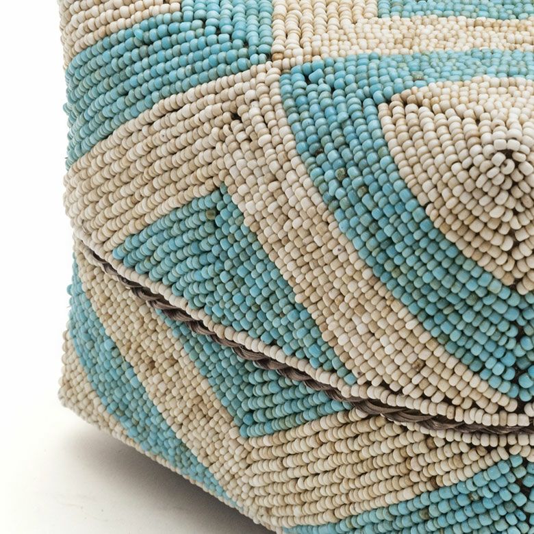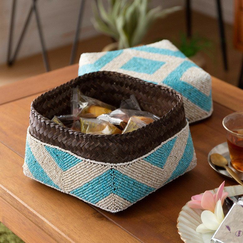 手作業で竹のスライスを編み、贅沢に底以外の全面をビーズで