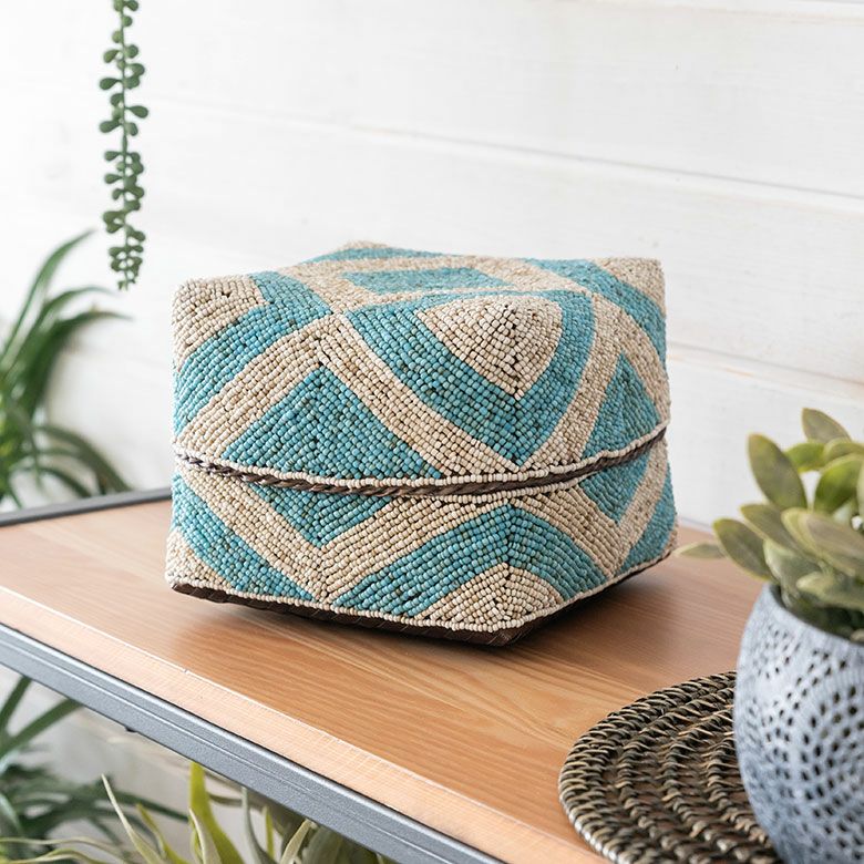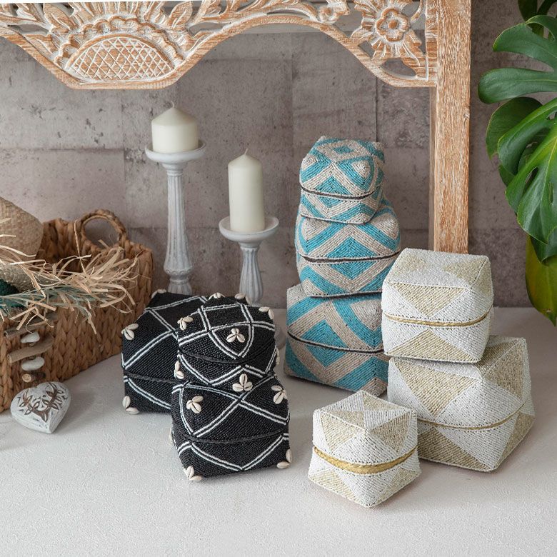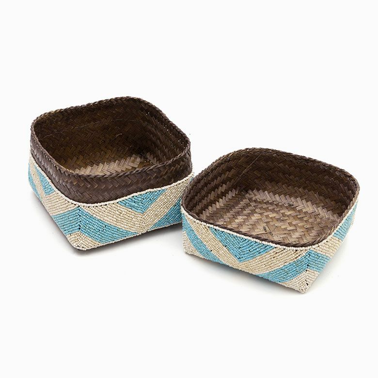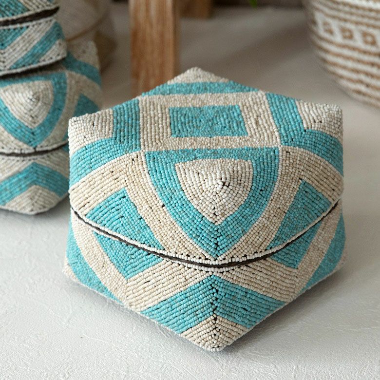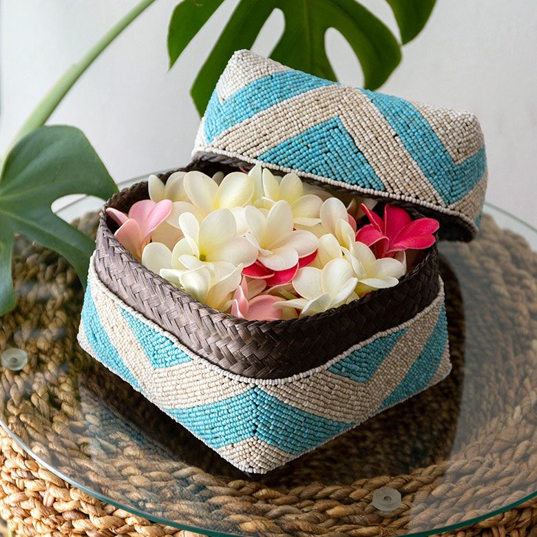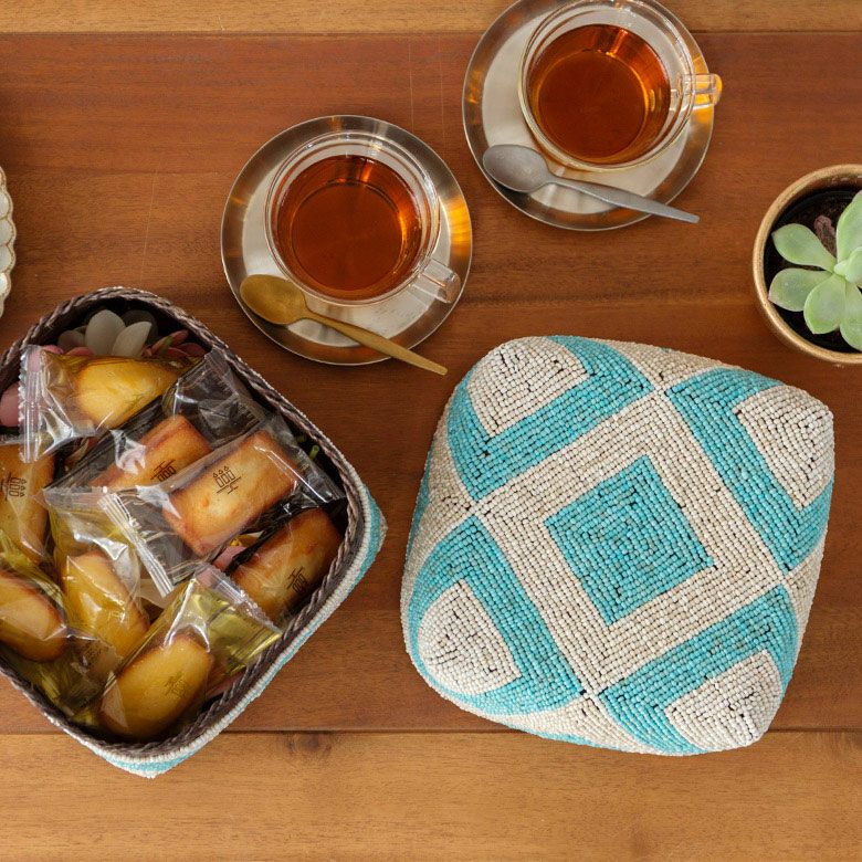 手作業で竹のスライスを編み、贅沢に底以外の全面をビーズで