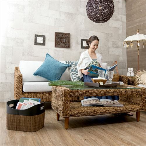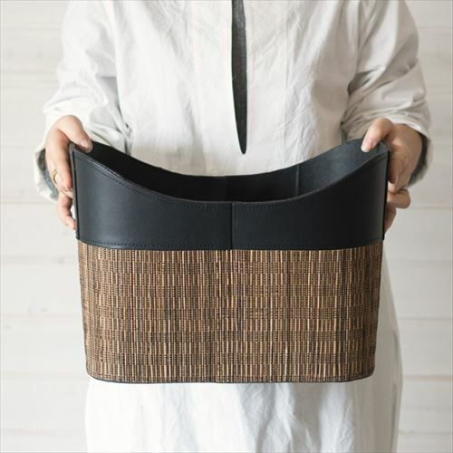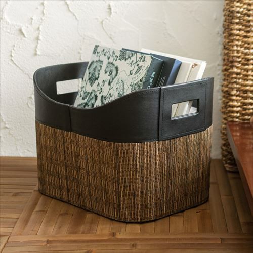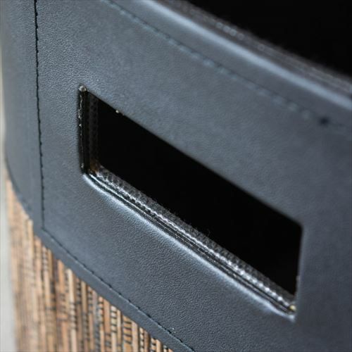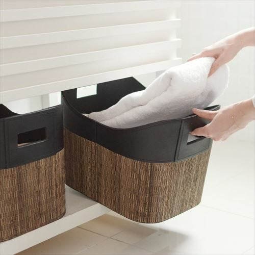 ・持ち手付きパームリディバスケットは、ヤシの葉の芯を乾燥させて編んだパームリディと合皮レザーで作られた収納バスケット