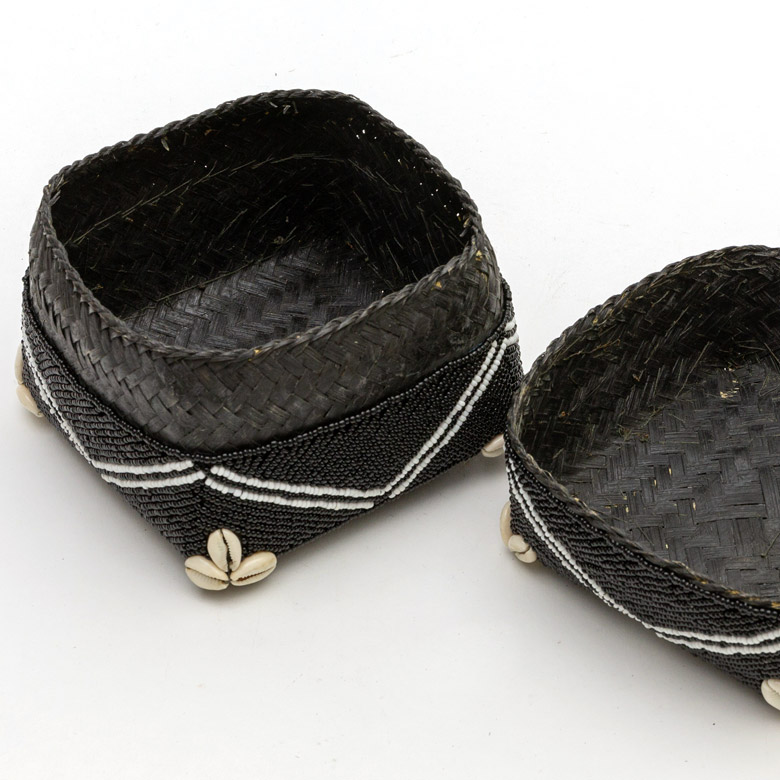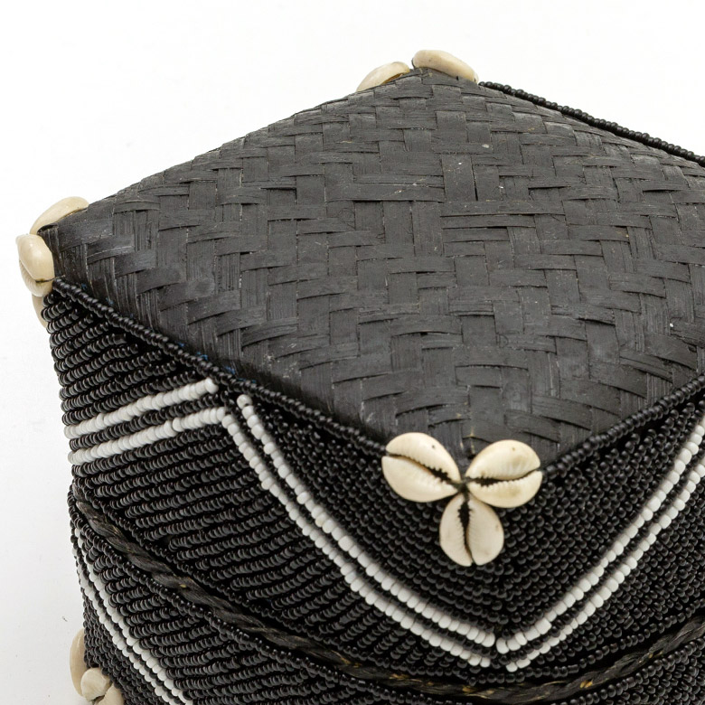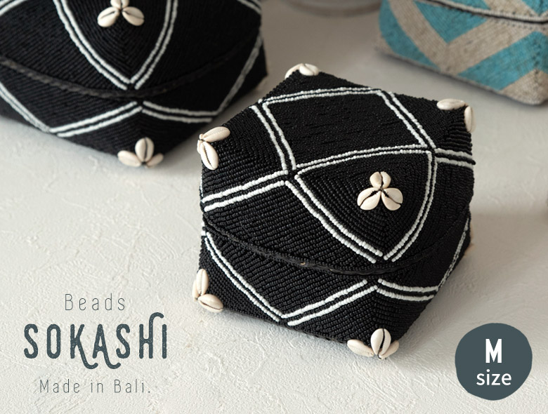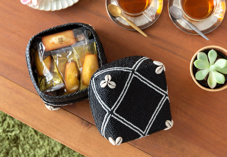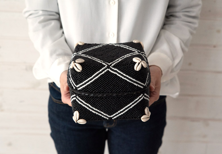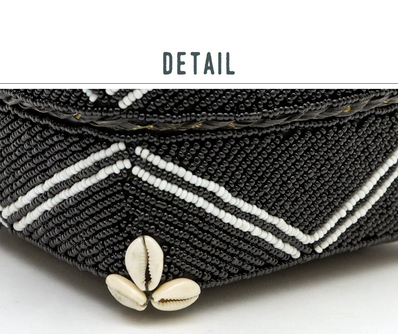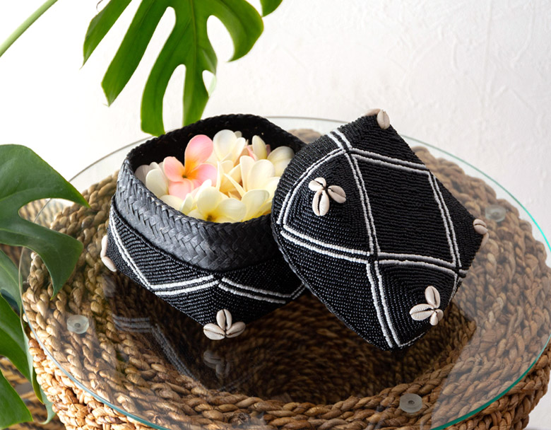 手作業で竹のスライスを編み、贅沢に底以外の全面をビーズで